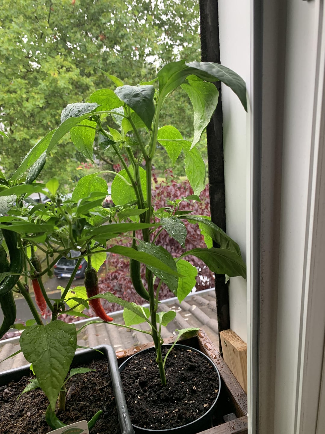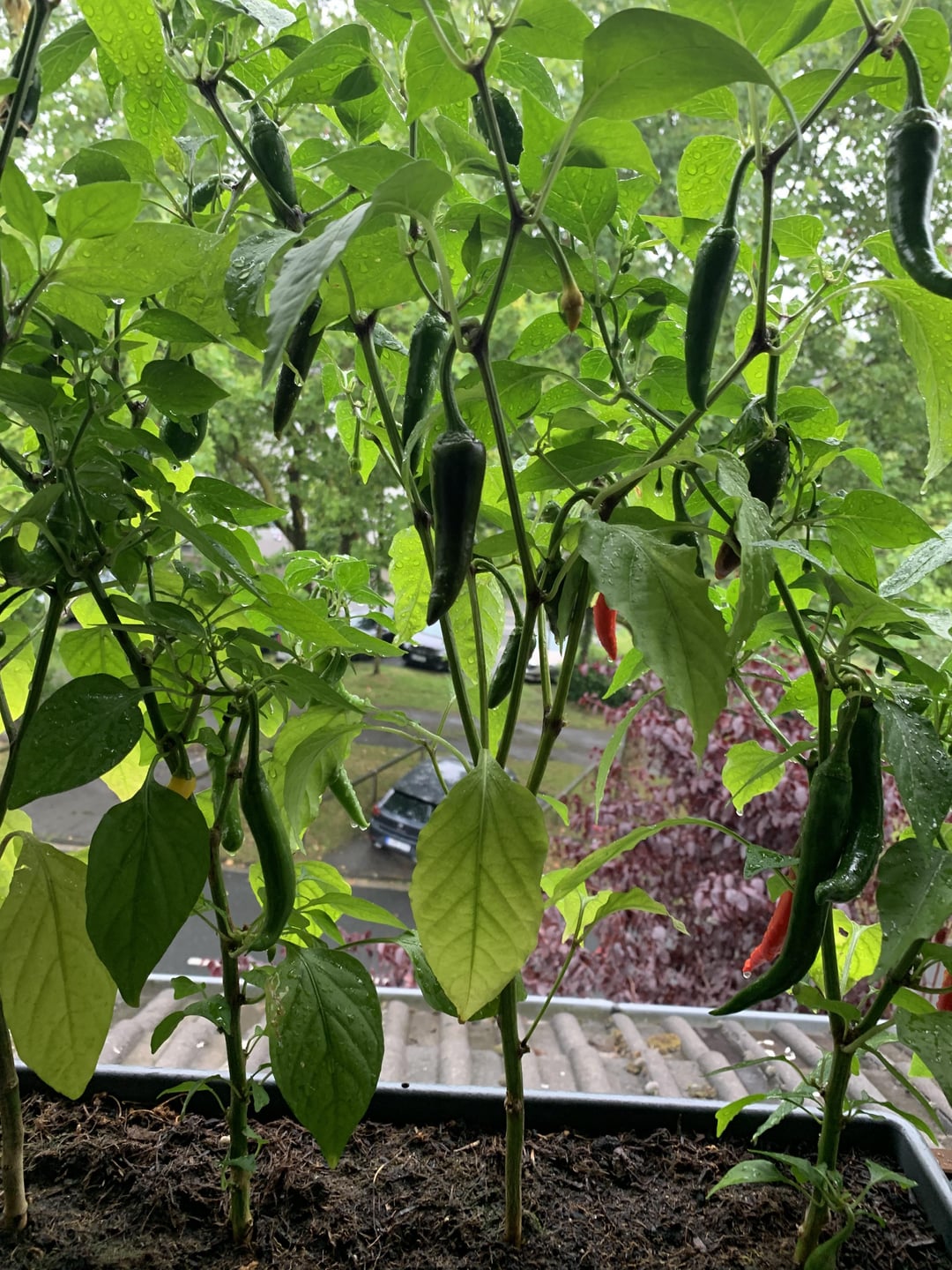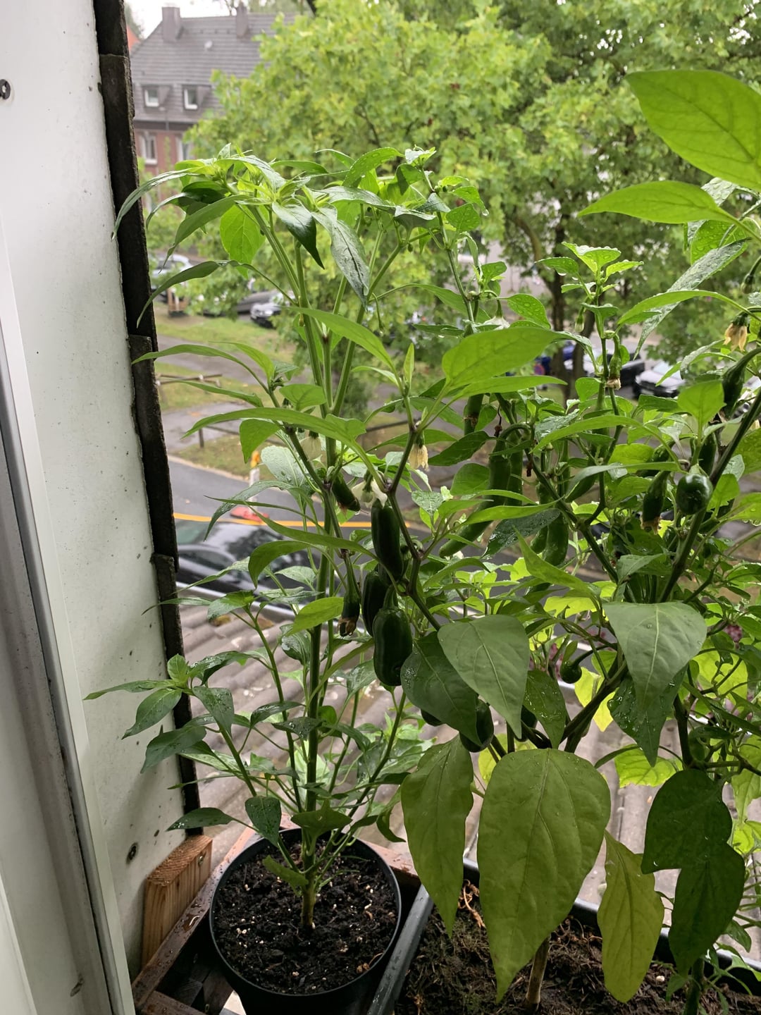 The 4 in the middle where bought as small plants from a store and the ones on the left an right have been raised from seeds. I’m happy that they are growing but just waiting for the ones in the side to finally produce some peppers 😂 bit since they already have some flowers, itshouldn’t take too long.