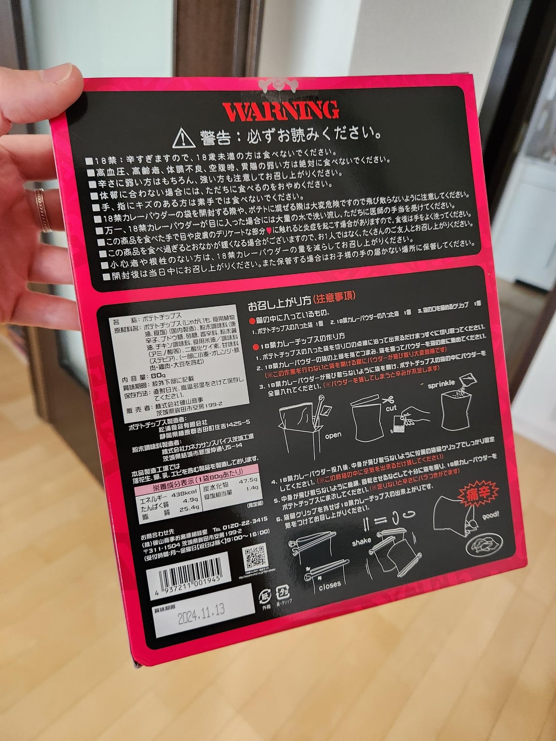 All things considered, they're actually really tasty. I thought it was going to be a ridiculous novelty at first, but they appear to have put a lot of effort into making some delicious crisps. The box is full of warnings like: don't eat if you're pregnant or have a weak stomach, eat them with your friends nearby in case you need help, don't eat if you're under 18, if you're timid then don't use the full spice packet.