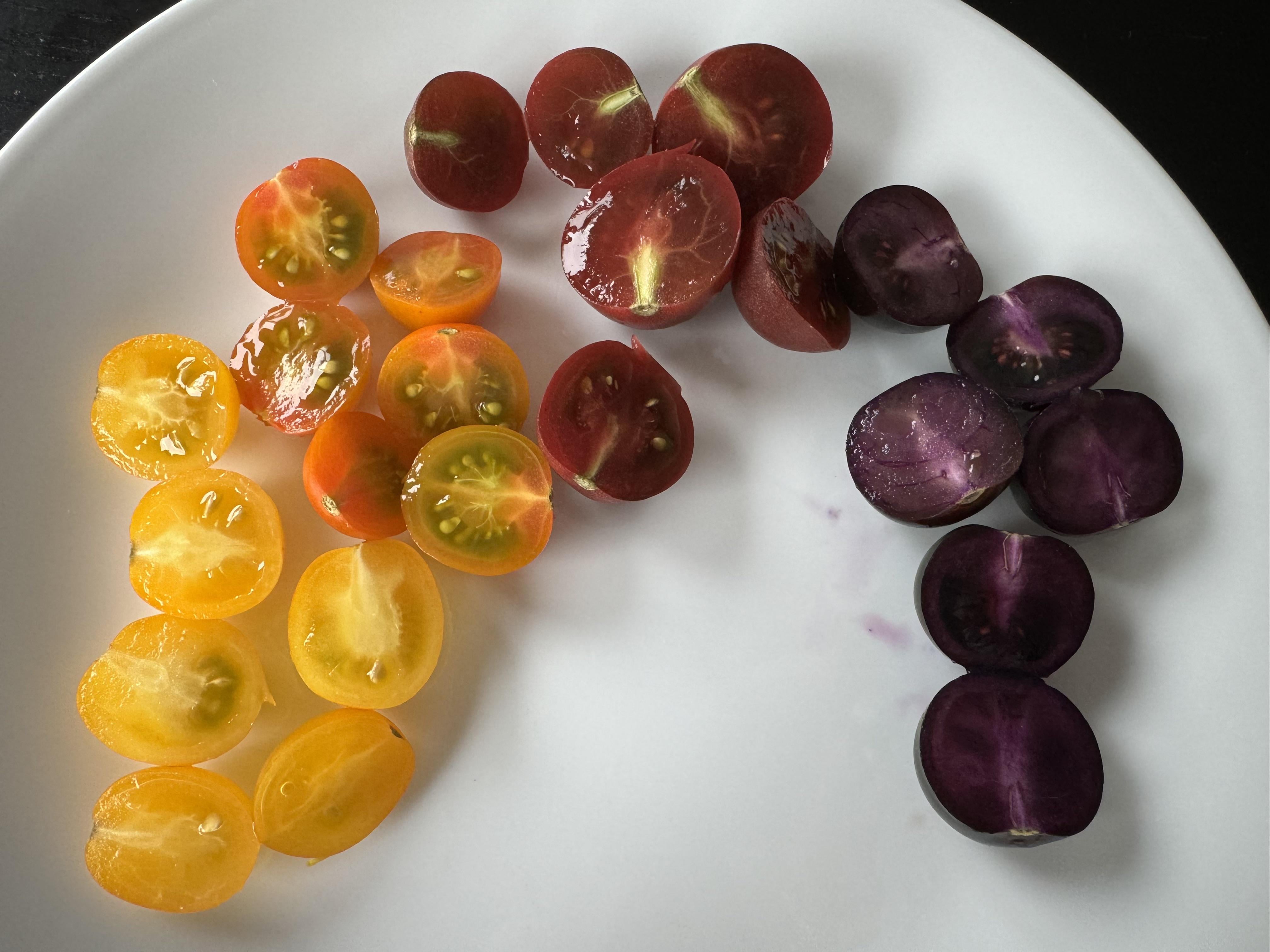 From left to right: sweet gold, sungold, black cherry, and the Norfolk purple tomatoes. The sweet gold were the mellowest of the bunch with low acidity and sweet. Sungold were very flavorful and more fruity with a bright, acidic bite. Black cherry are more mellow like the sweet gold but with a slight savory aftertaste. The purple tomatoes have an odd herbaceous flavor that is really pronounced when tasted in comparison to the other tomatoes. The flesh is firmer in the purple tomatoes while the skin on the sungold is the thinnest.