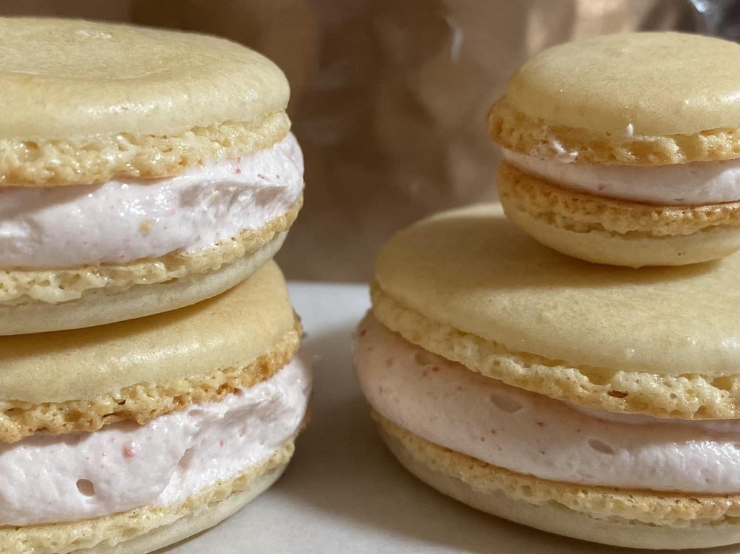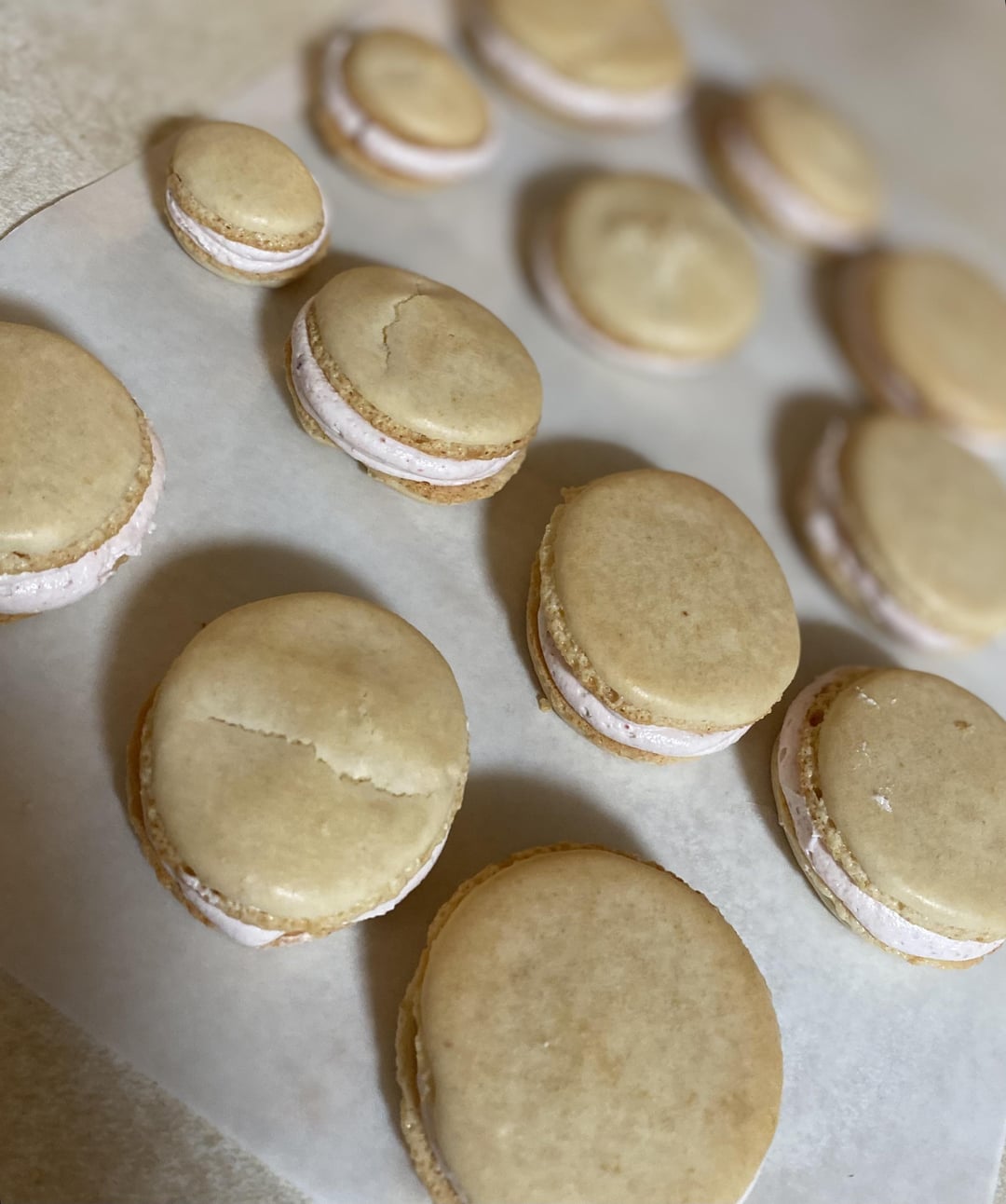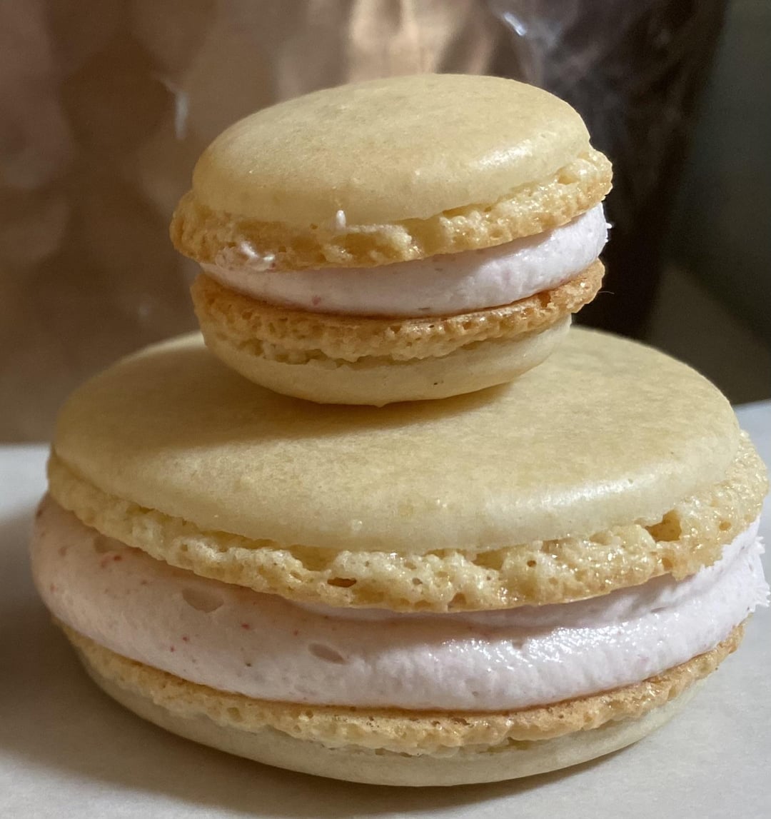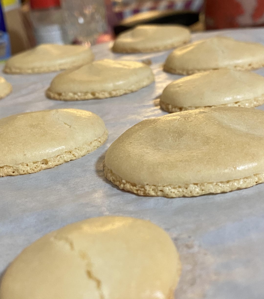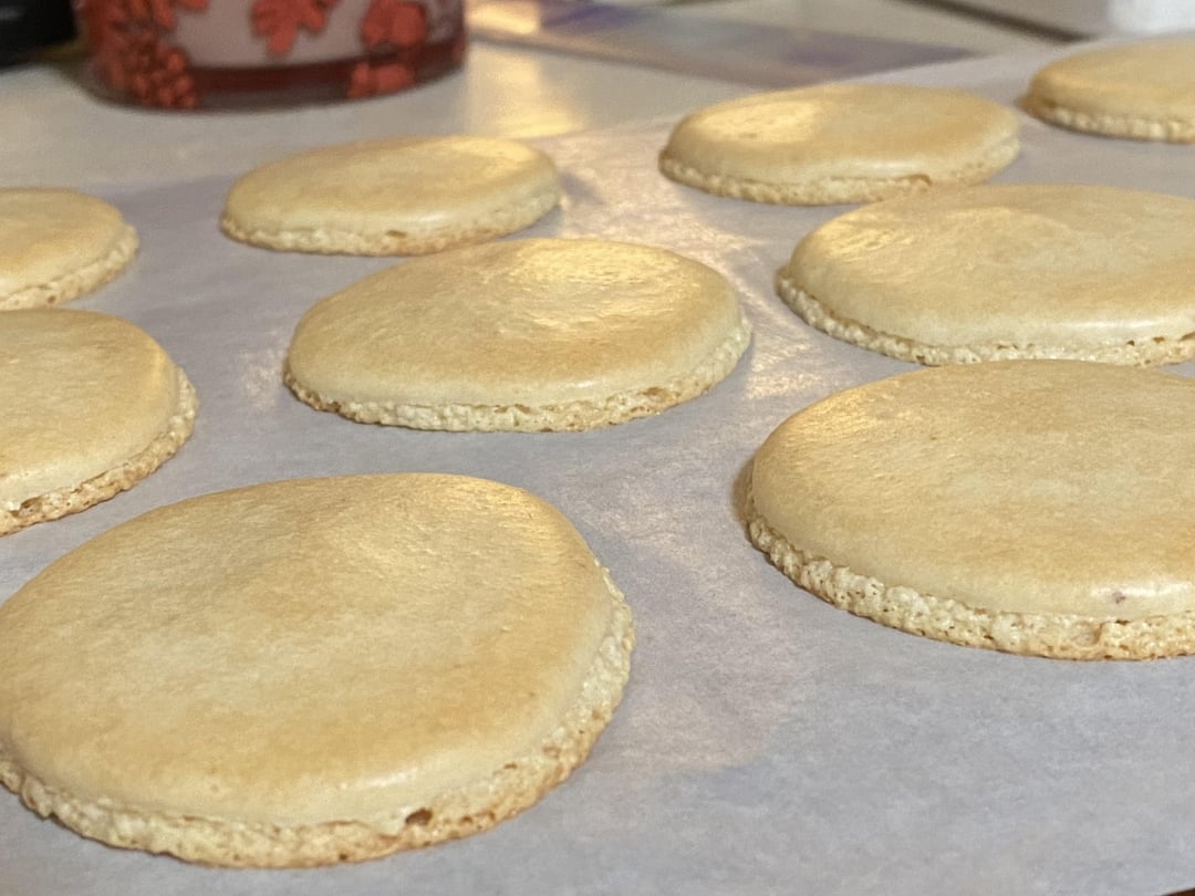 So, after thinking/fantasizing, and binge watching YouTube, I finally decided to attempt macarons. Excuse the filling, I think it was too thick BUT I’d love to know what you think about the shells. I’ll say that I DO feel I went a bit too far with the macronage step and am wondering is that maybe why they spread out too much after piping? I also feel I underbaked them bc they seemed wet looking in middle and they did stick to the parchment when I took them off. I was so worried they would get too brown I think so took them out too early. I’ve tried choosing pictures that really show my problems so please give me advice about what I could fix for next time. And really, what’s everyone think about those feet? I feel they went too vertical: aren’t they supposed to kind of be the same vertical as the tops? And are they horizontal enough? ALSO, I didn’t want to use artificial dyes so I didn’t color them. Can anyone recommend natural dyes that work? I’ve never used natural and want to switch to it for all baking. I WAS going to put some freeze dried strawberries into these but decided since it’s my first time I should stay safe with simple.