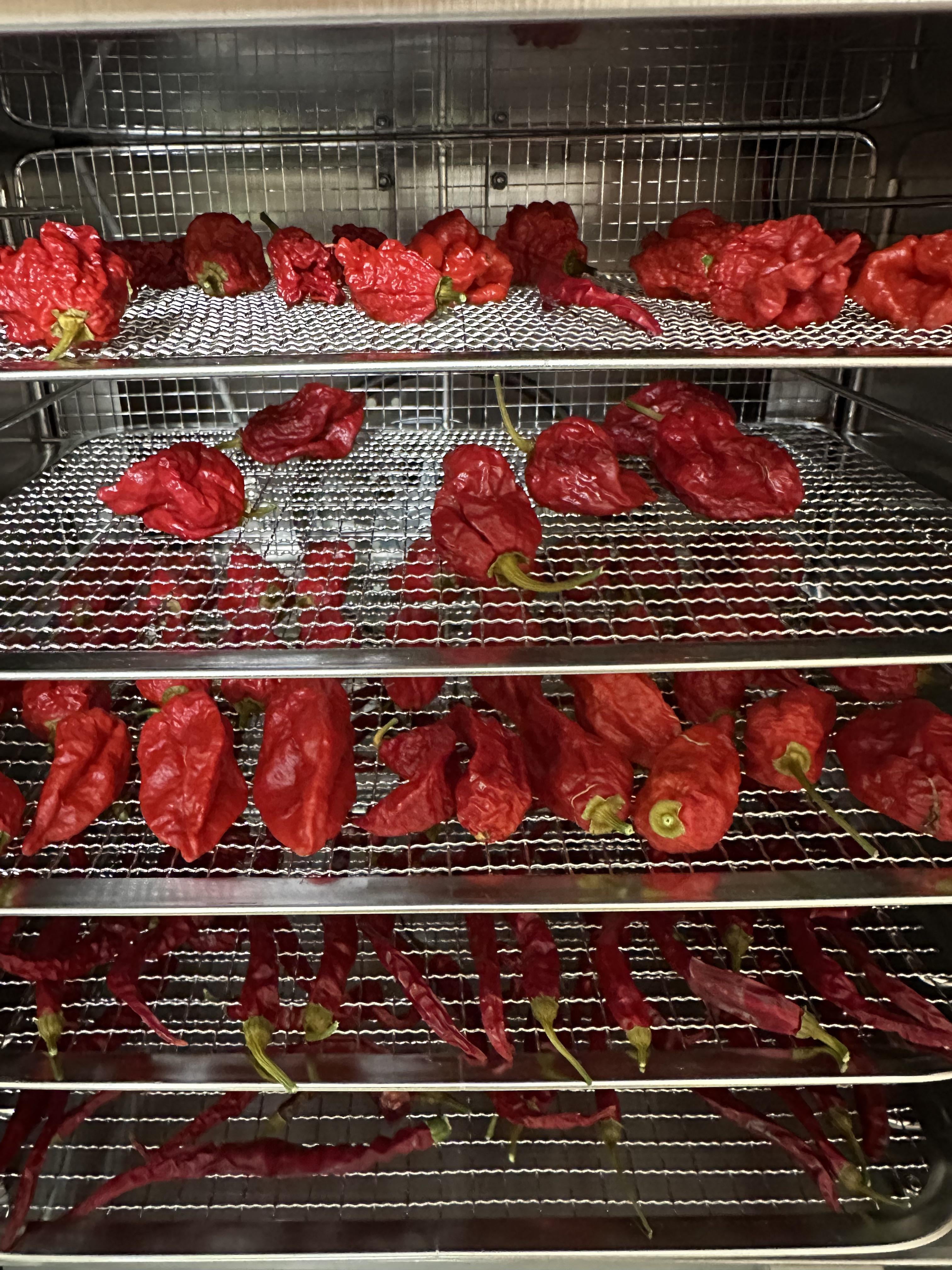 What should the texture be? The after 9 hours the Thai chilies at the bottom are crumbly. The reapers at the top are soft but seemingly dry. What is my goal? I feel like I want them all to be crumbly but I'm not sure what's best. Is there sucha thing as OVER dehydrated? I do wanna make some dry rubs and seasonings with them. If anyone got any good recipes,please lmk.