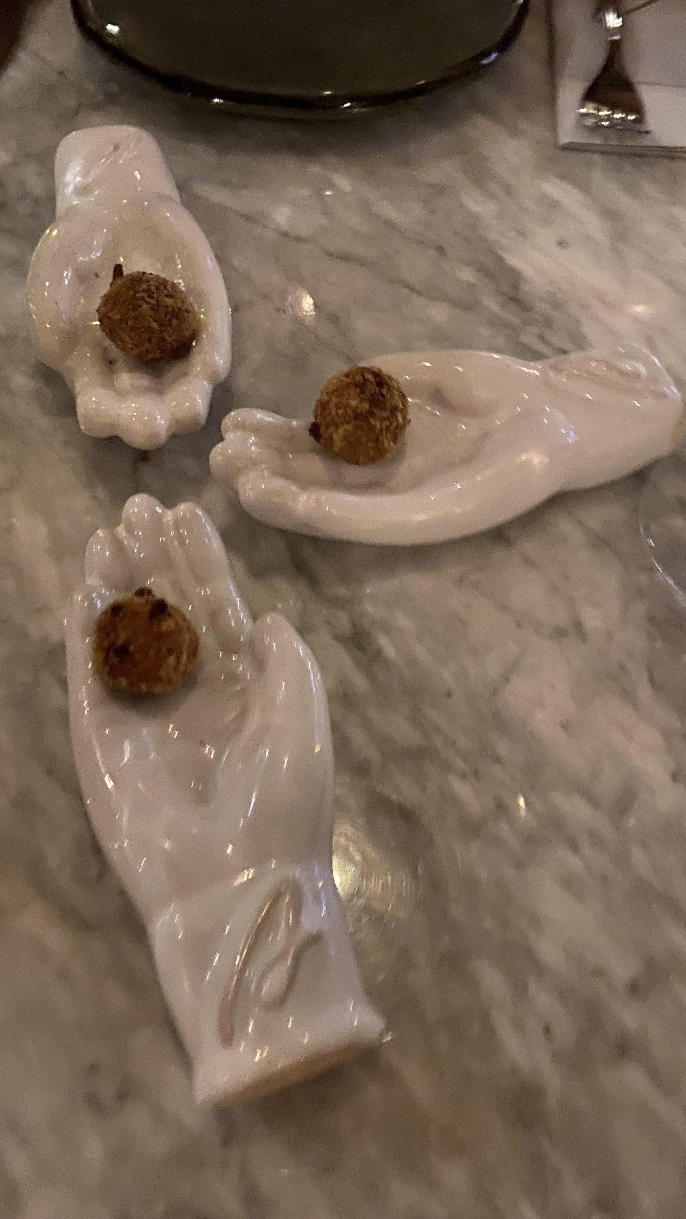 I wonder how many have fallen on the server’s tray or floor en route to the table. Maybe they just put em in their pocket and sleight of hand them onto the hands at the last second.