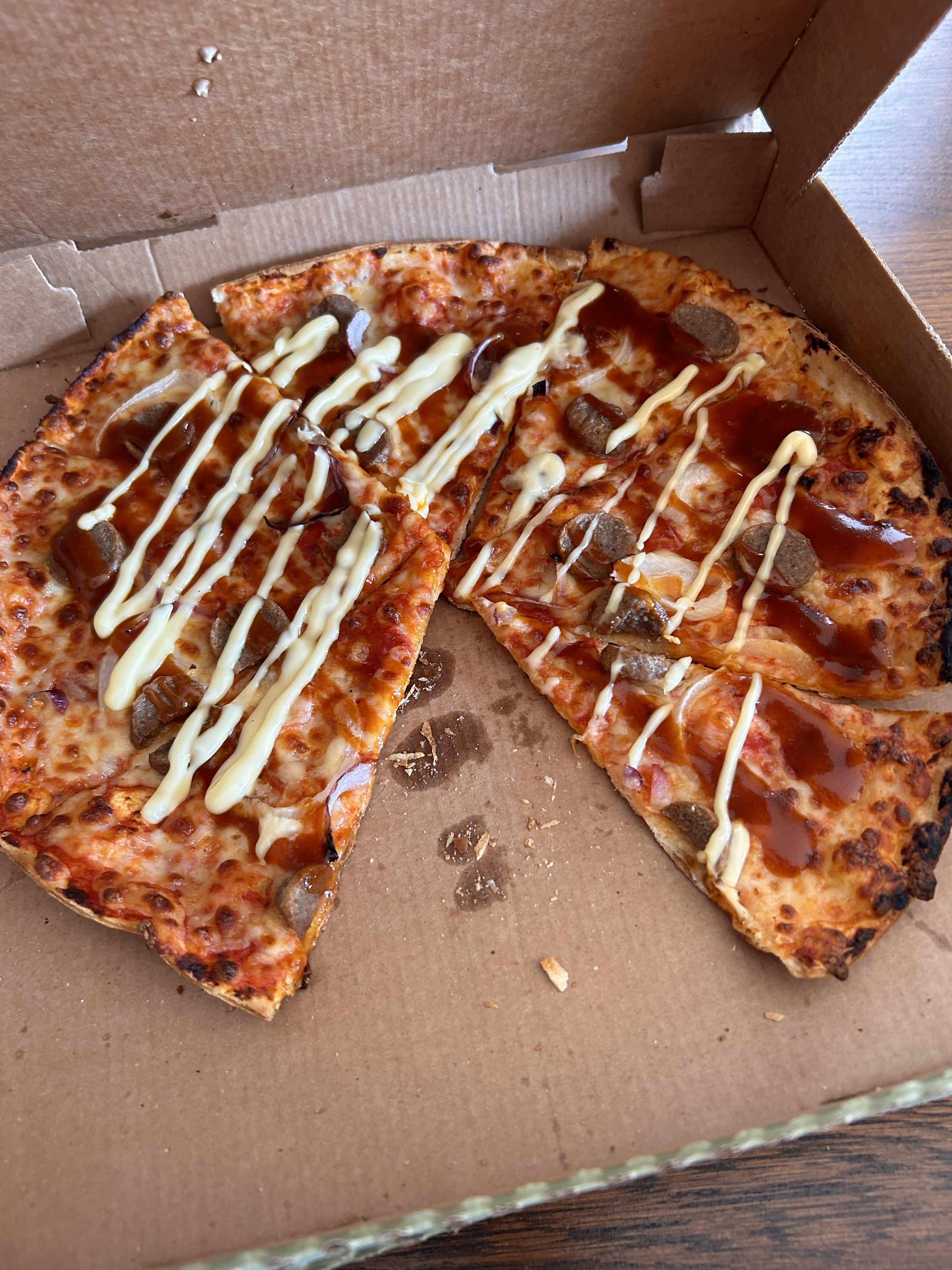 Is that Mayo and bbq sauce on a pepperoni pizza?