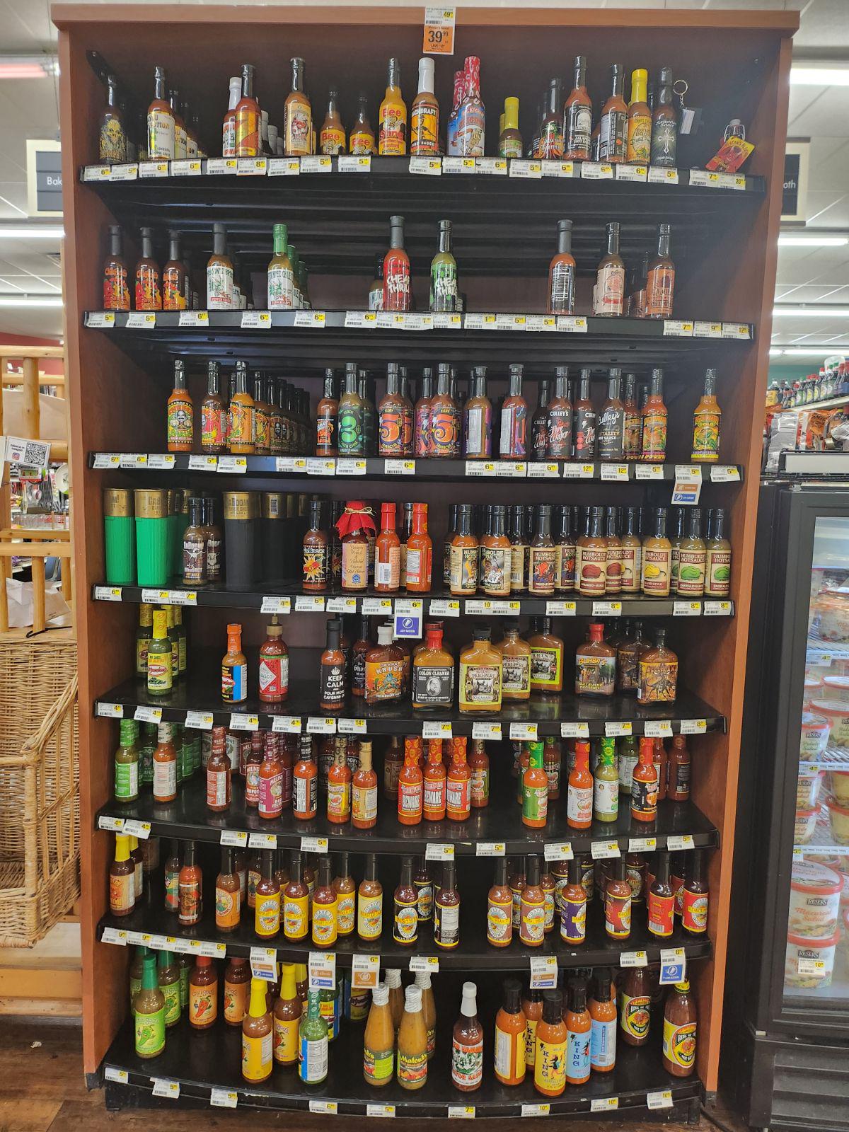 Image is a little low res to be able to read a lot of the labels, but the Gator Hammock sauces, Iguana sauces, Marie Sharp’s (Belizean Heat is my fav), and the Dave’s Scorpion and Masala Madness are all good picks.