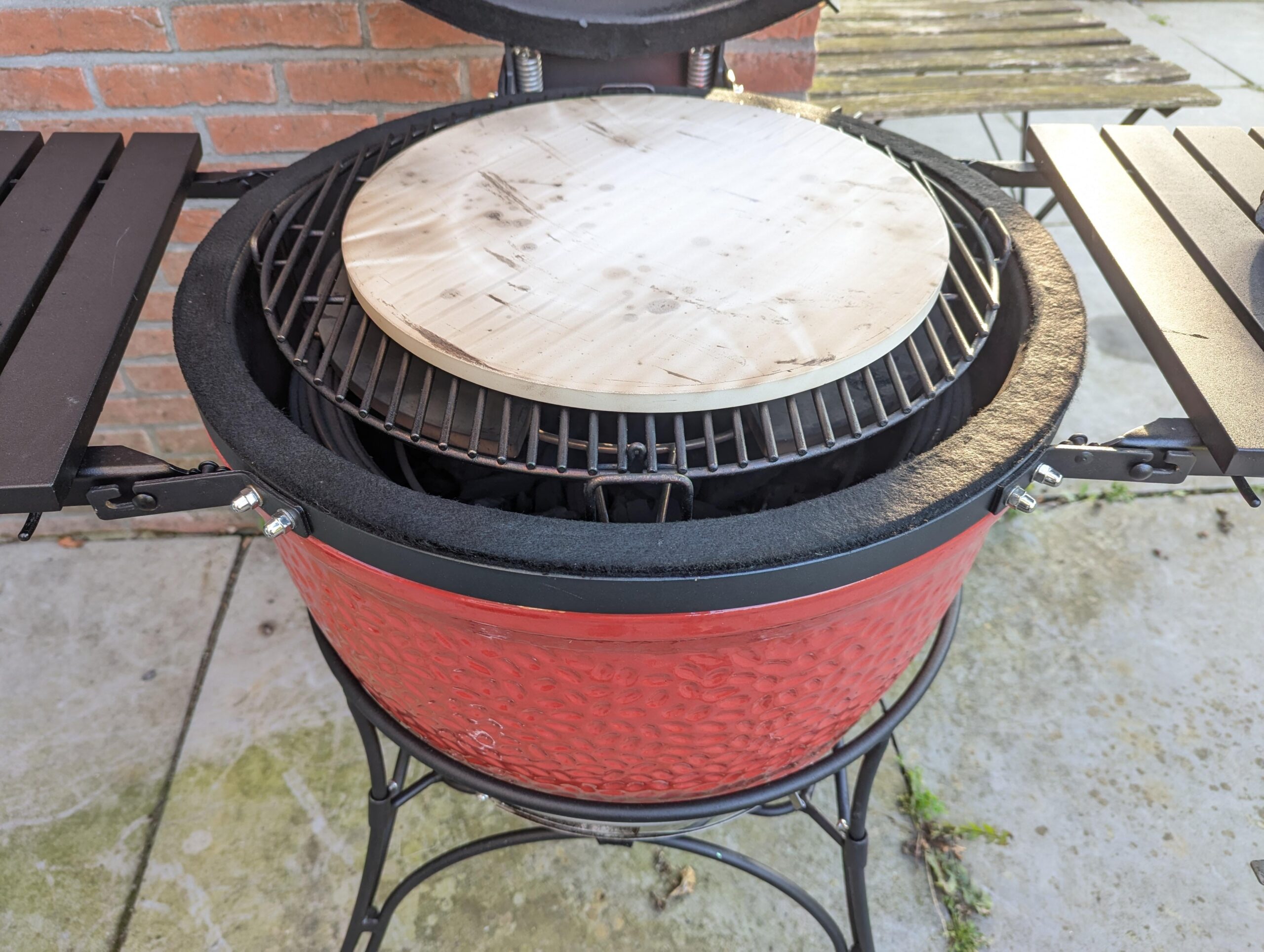 Heat deflectors on the grates, 1-1 1/2” spacers or aluminum balls then pizza stone on top. I use threaded pipe fittings