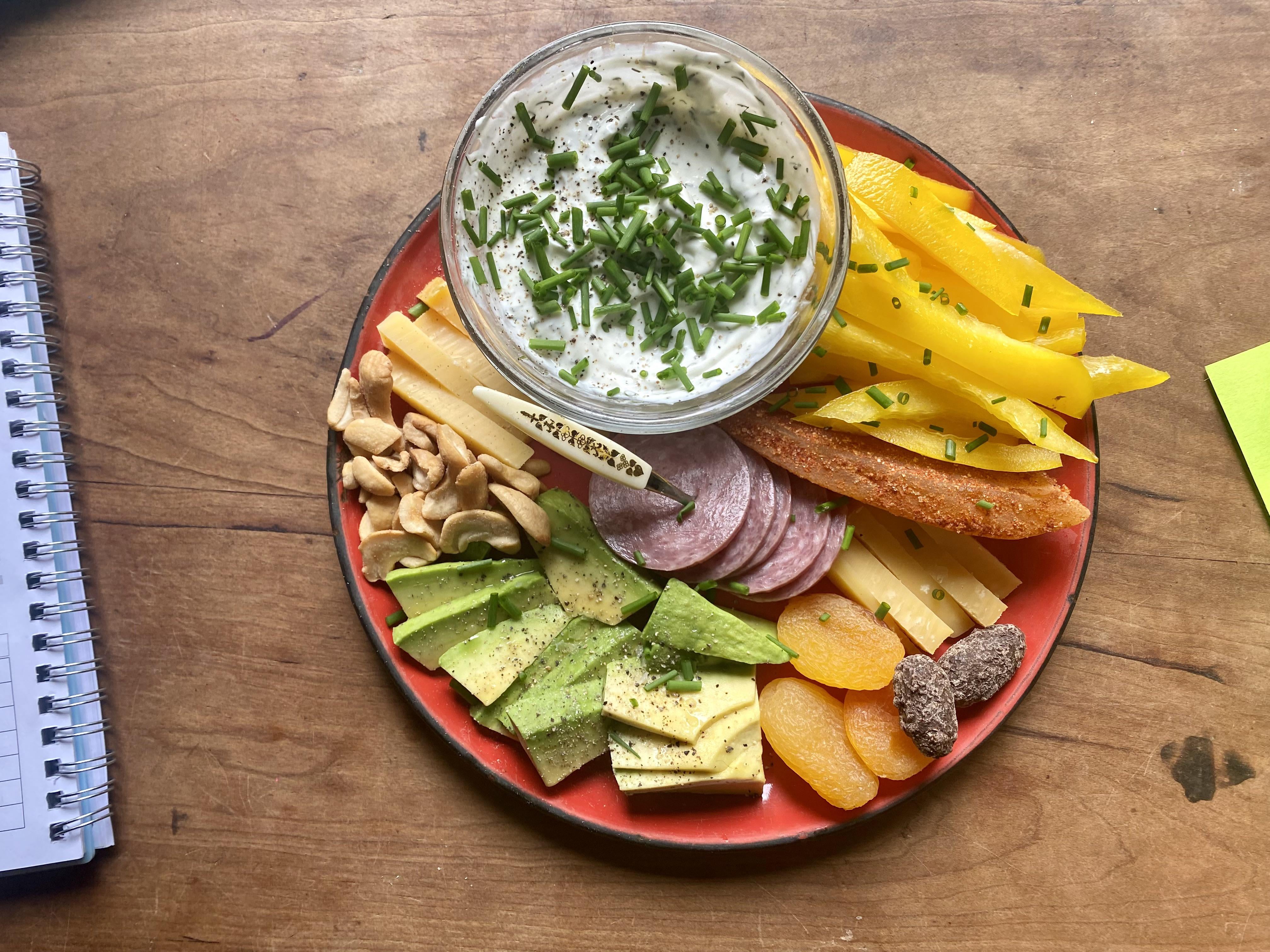 Bell pepper, homemade ranch dip, Gouda, cashews, avocado, salami, dried apricots, sea salt chocolate covered almonds (them Trader Joe’s ones 🔥), chili mango.