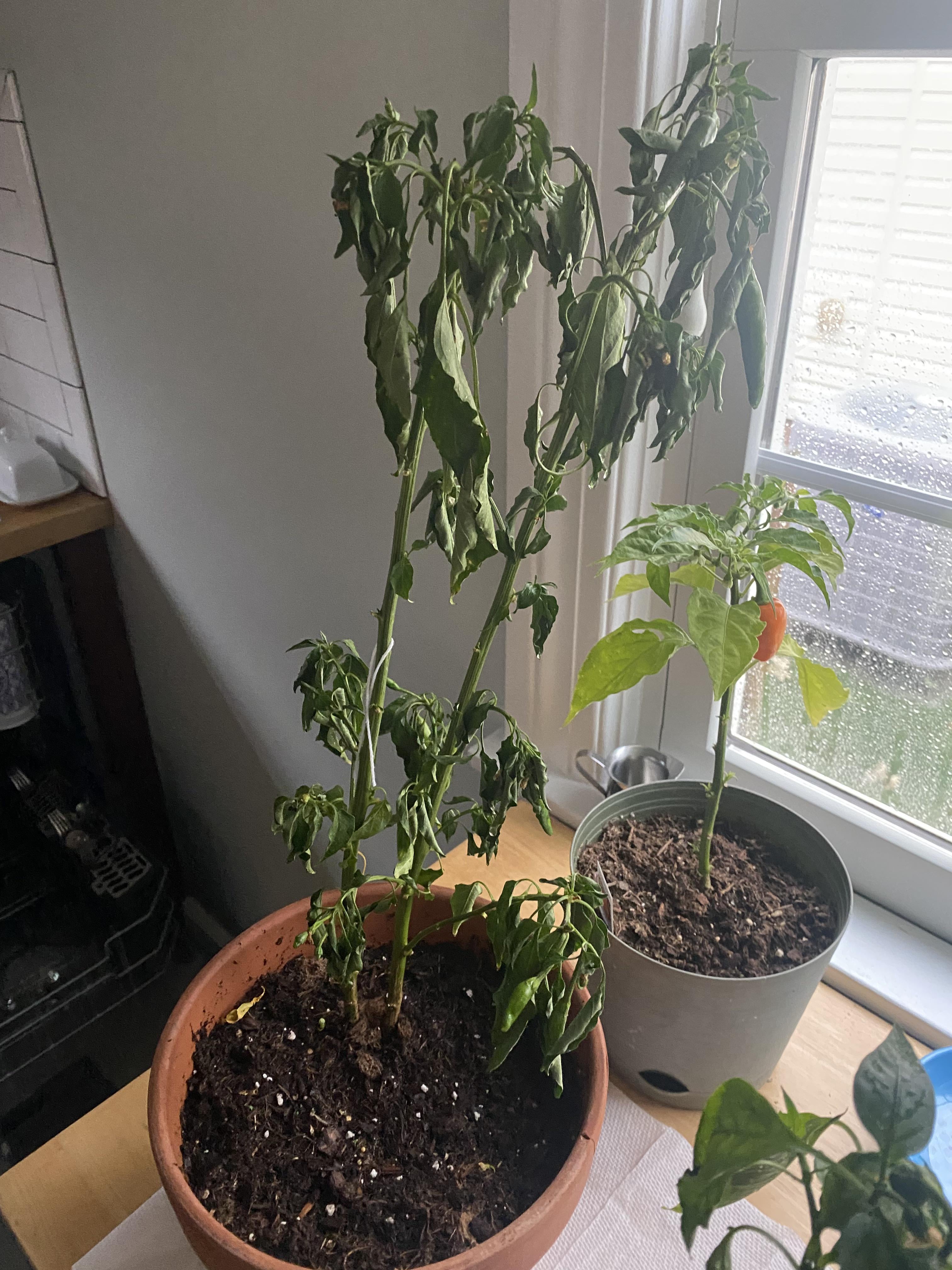 So this is weird, this pepper is probably my most mature out of all of my peppers (I have 6) it’s produced a lot of peppers and it’s still producing them quite a lot. I have 2 main issues her. 1. You can clearly see that it looks sick or it’s wilted, I couldn’t tell you why it’s doing that. I leave it outside in partial/direct sunlight all day long (I brought it inside because it’s storming bad out right now) I wanna guess and say that it’s probably overwatering, but I don’t think it’s been watered too much recently. I feel like it could also be too much sun but the sun hasn’t been out recently (also wanna mention that at night it seems to go back to normal, still looks a little wilted) 2. Why won’t my plant stop leaning like that? 😂 I’ve resorted to tying one of the plants to a stick and it seems stand up just fine. That’s all tho, any guesses?