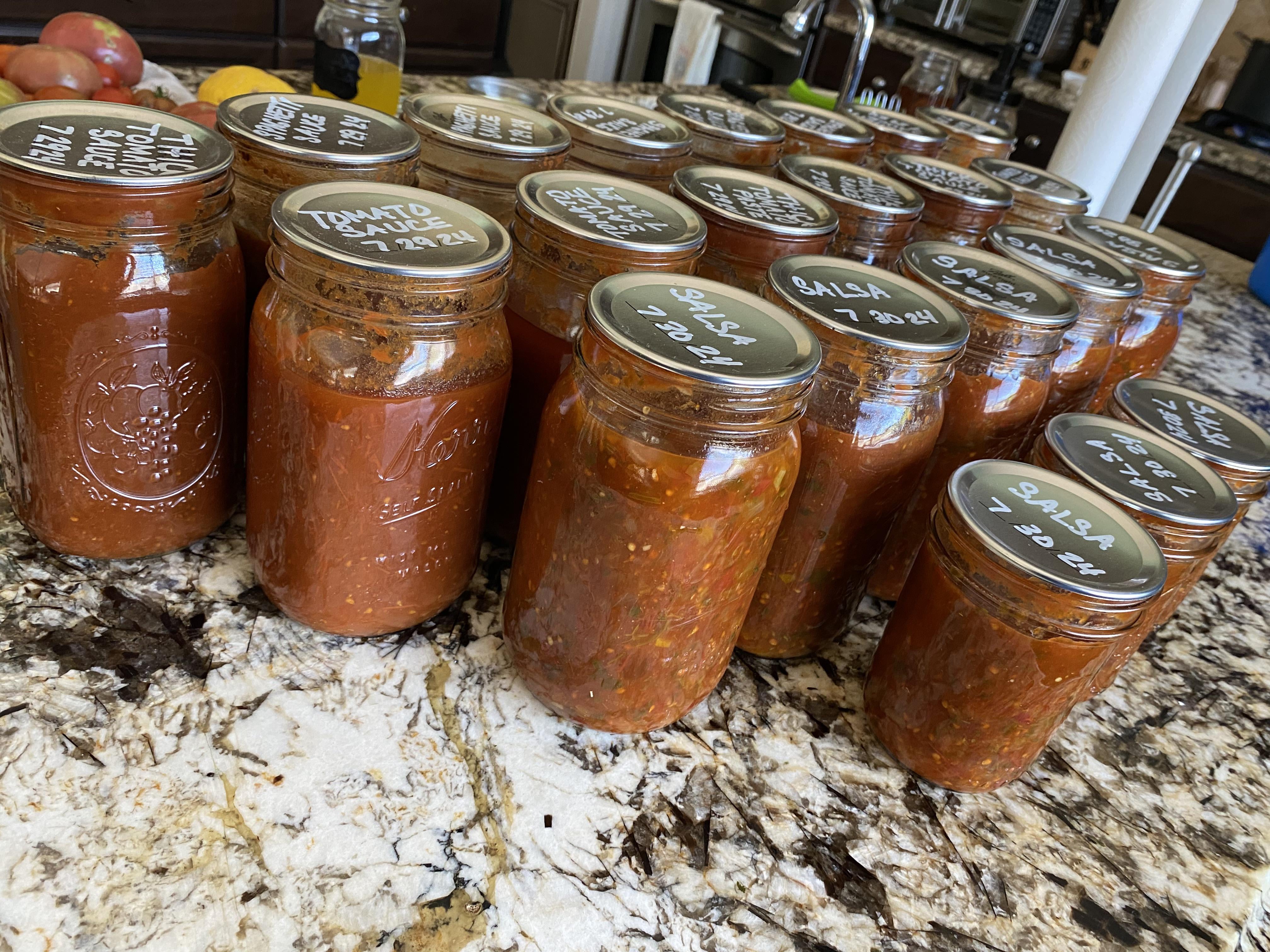 Last weekend I made 7 quarts of spaghetti sauce, 7 quarts of tomato sauce, and 6 1/2 quarts of thick salsa, as well as 4 quarts of lacto-fermented fermented salsa. The week before, it was 16 quarts of tomato soup. This weekend, I’ll make ketchup. I am harvesting about 50 lbs a week now! Please share more ideas for preserving the harvest! 🍅🥫