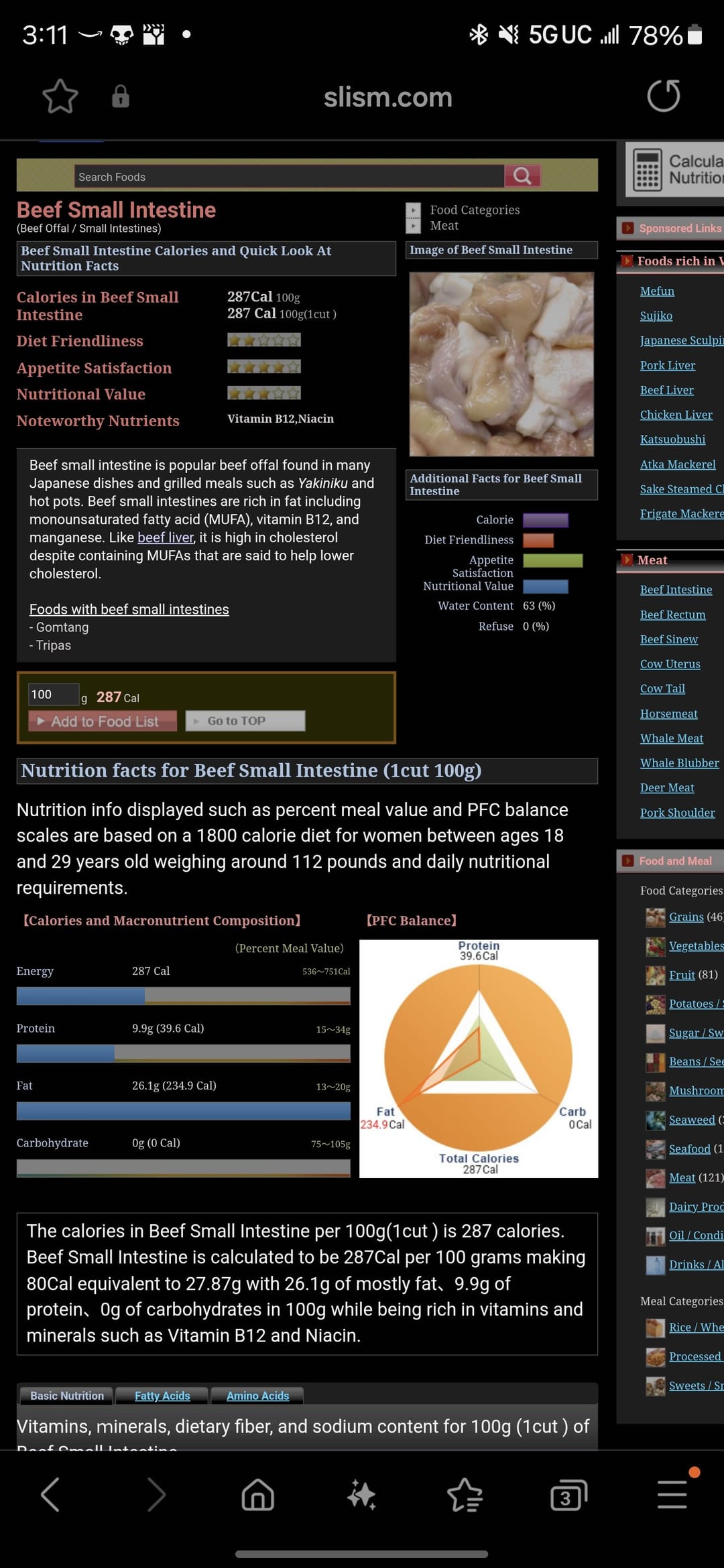 I like to eat small beef intestines from Hmart and KBBQ and try to figure out which is more accurate when it comes to the calories, protein, and fat. There aren't that much details when it comes to it and my trainer and I have been fighting about which one is right. Would appreciate the help.