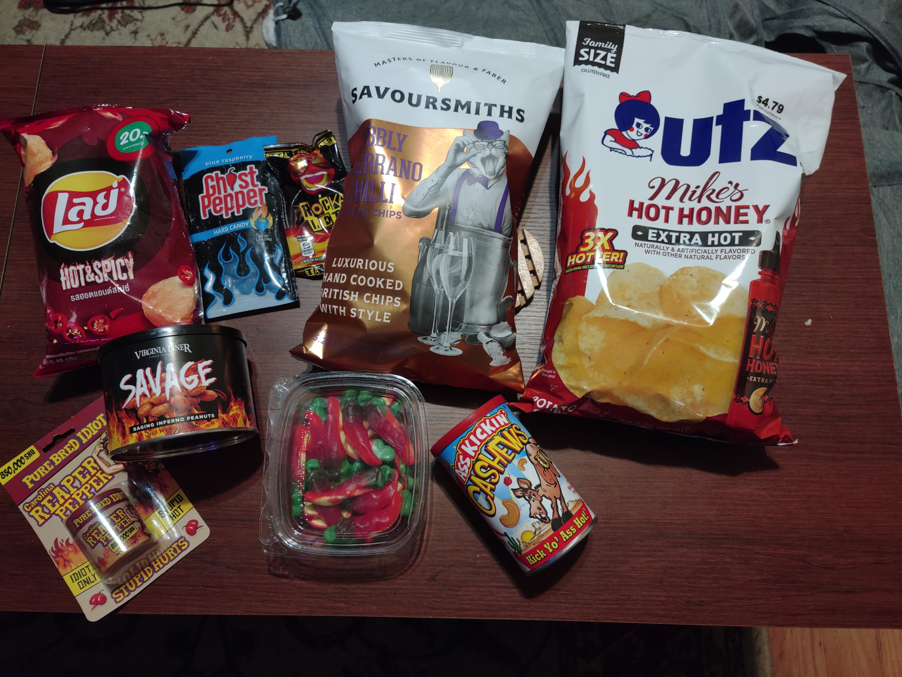 Of what's on the table I've only tried the nuts so far. Vastly prefer the Savage ones. They are less spicy initially but build to a very comfortable and pleasant heat. Like a roaring fireplace in your mouth and every bite adds a log. The cashews (habanero) are okay heat wise but the seasoning is kinda thick and makes it hard to eat more than a few at once (grittiness/saltiness). Excited for the rest, the seasoning powder boasts 850k SHU but the cartoonist label has me doubting how good it will be.