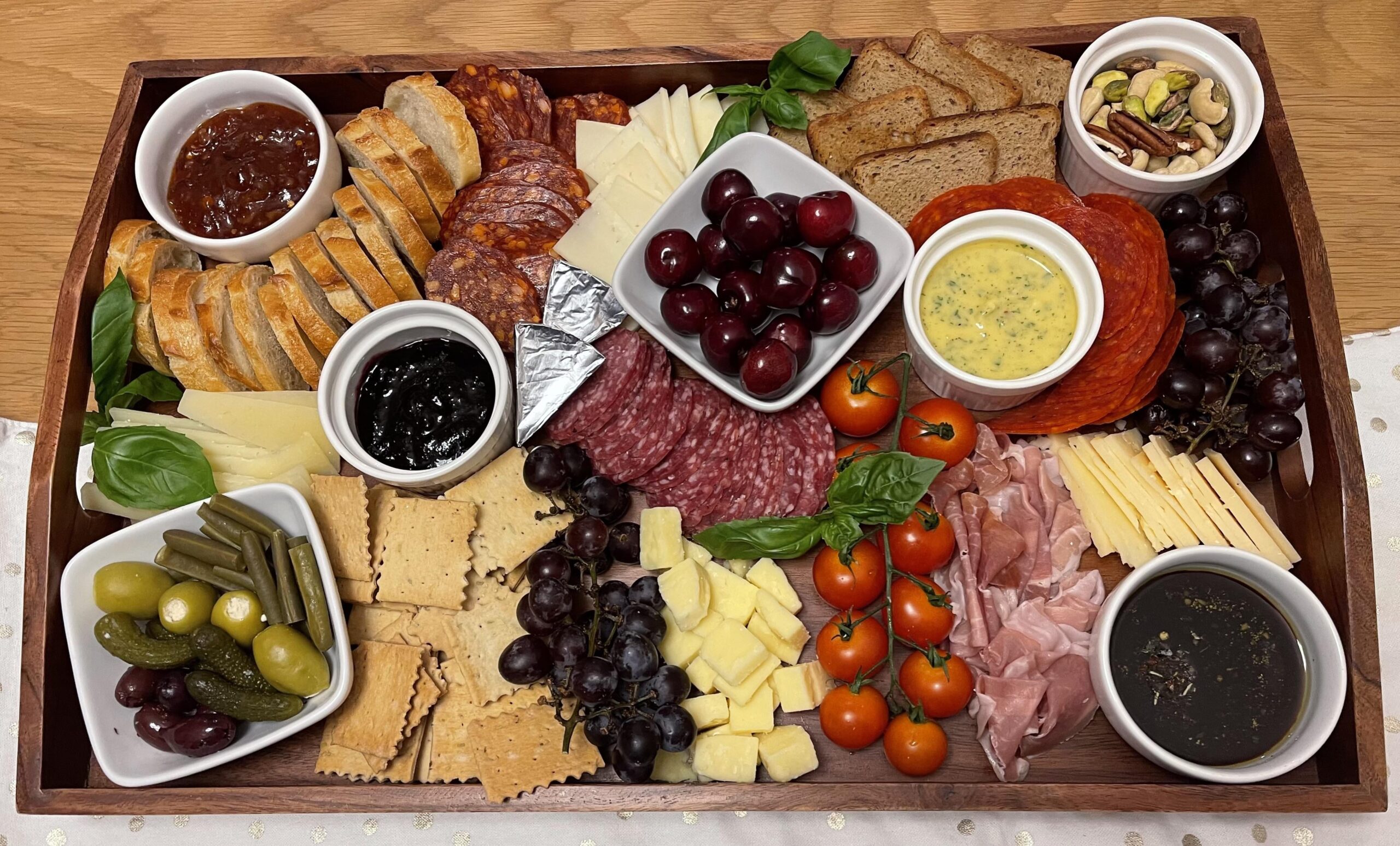 Personally, I would have not put the cherries, nuts, and olive items in containers, just put them on the board somewhere to eliminate so many containers. The variety is great!
