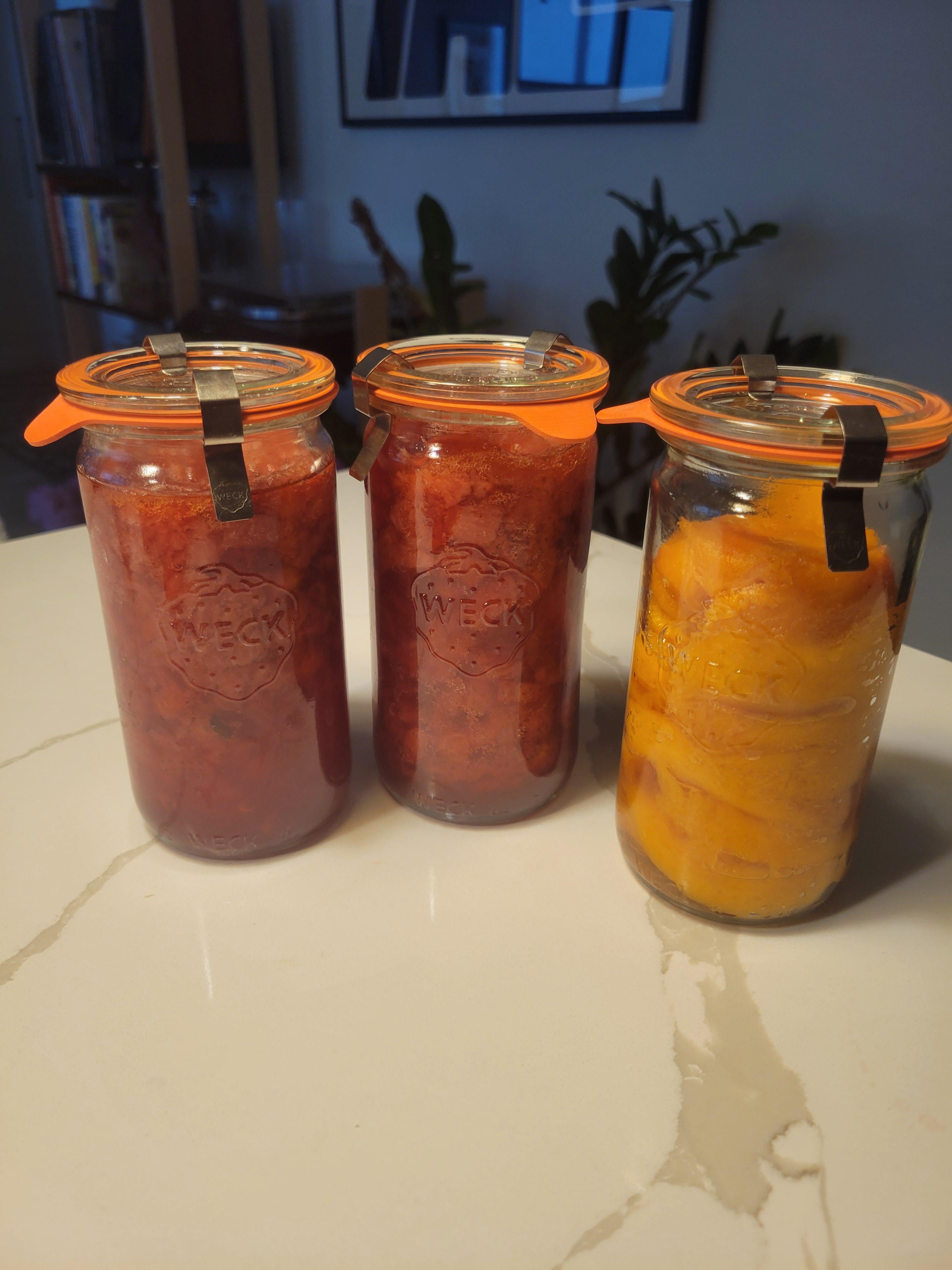 I'm also hooked on Weck jars, they're so pretty and sturdy. I can justify the expense because I'm not making huge batches of stuff, just enough for me at the moment until I can trust that I have the processes nailed down. I got these on sale at the Container Store for under $5 each, and I love them. They sealed well, too (tested them by looking at the tab, and also took off the clamps and shook them by the lid). Only one didn't seal, and that's the jelly I'm eating today.