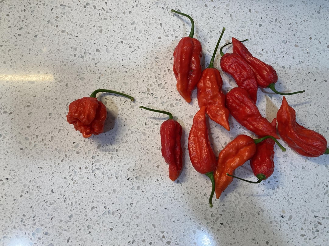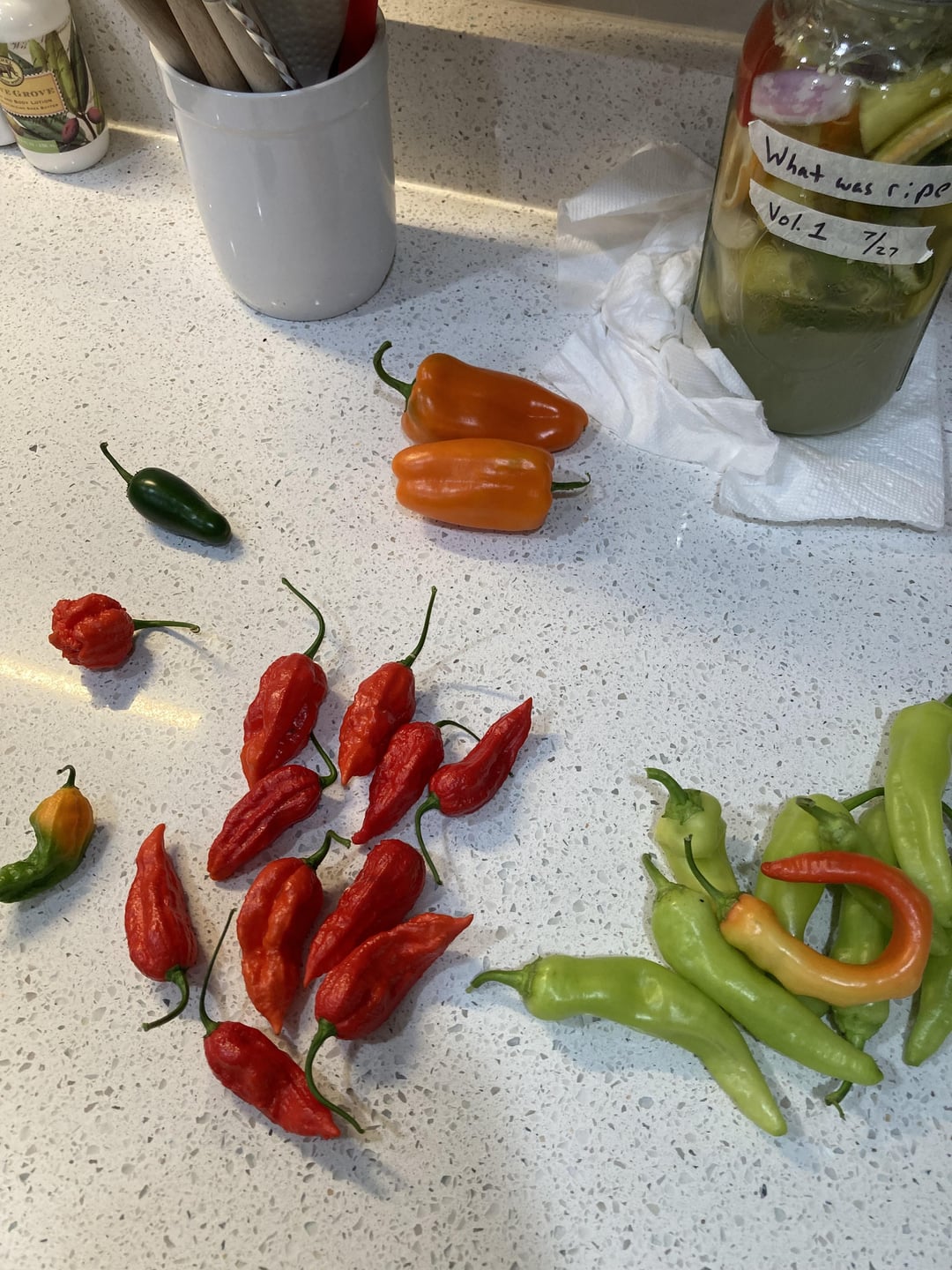 Also 10 ripe ghosts (+1 greeny), sweet banana peppies, 1 jalapeño and 2 “orange bell peppers”