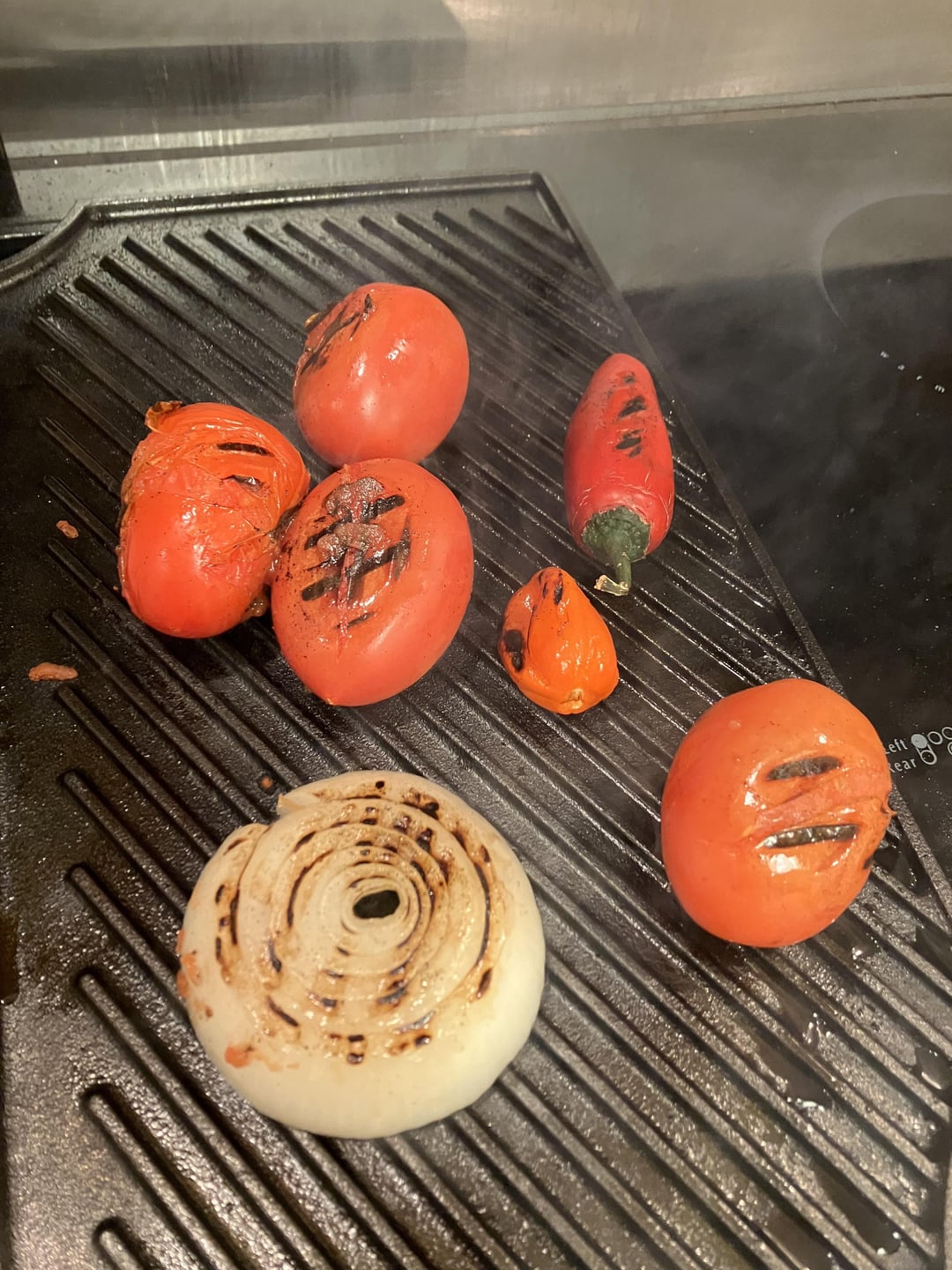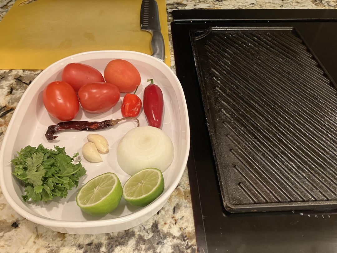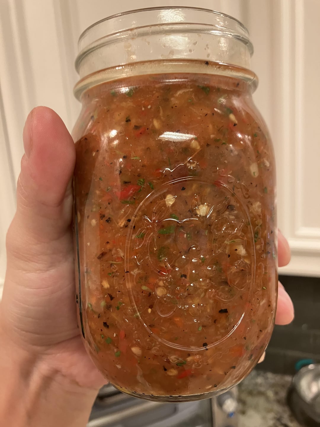 4 roma tomatoes, half an onion, red jalapeno, red habenero/savina, chile de arbol, garlic cloves, lime, cilantro and salt to taste. Chilled for a few hours to meld flavors.Very happy with the results! by slowerlearner1212 2 Comments DeliciousPumpkinPie 1 year ago Sounds tasty! Might have to whip up some of my own… if I can find any decent fresh peppers! DrJamesFox 1 year ago Oh yeah that salsa has a tasty looking color to it.Write A CommentYou must be logged in to post a comment.