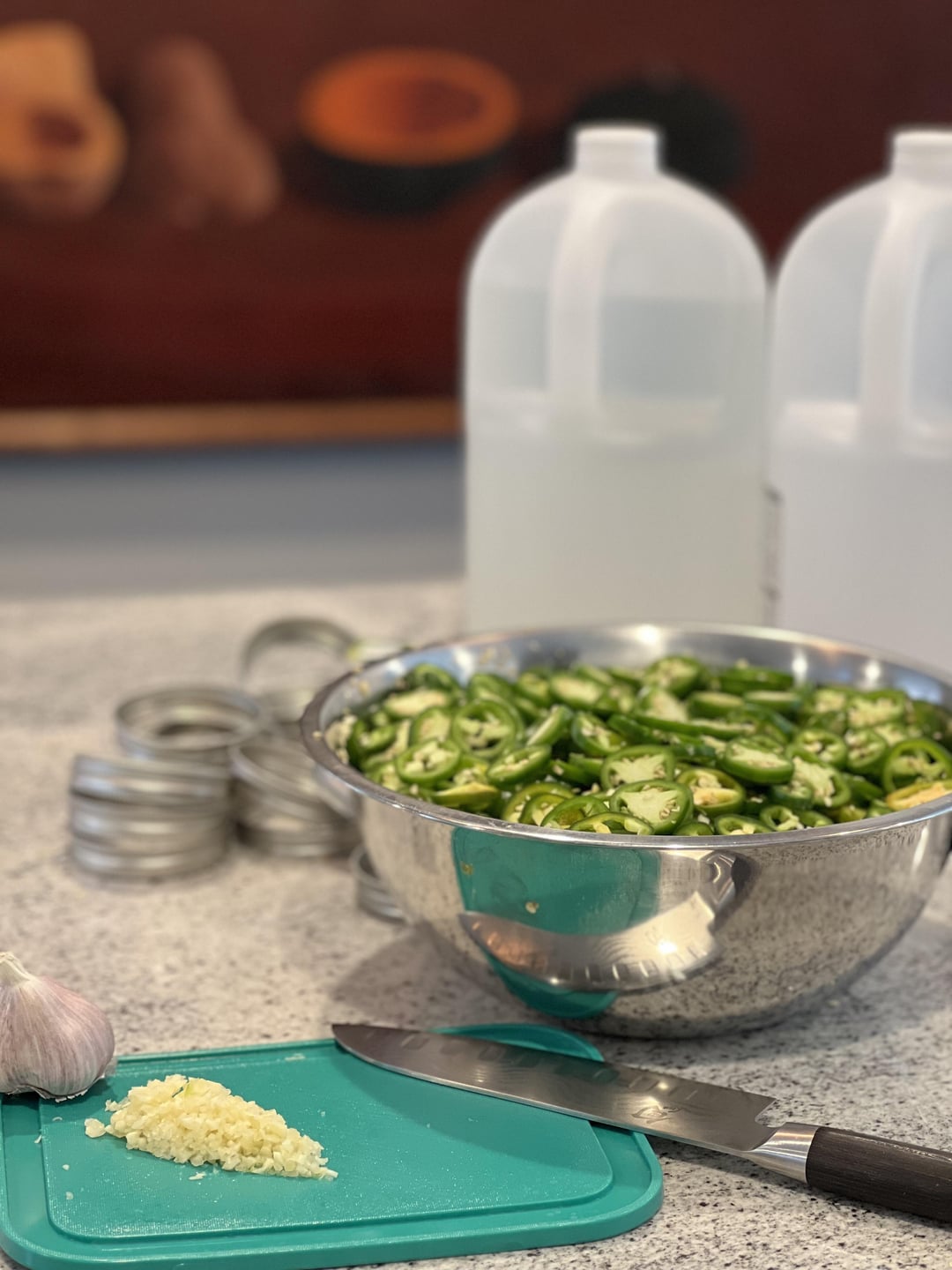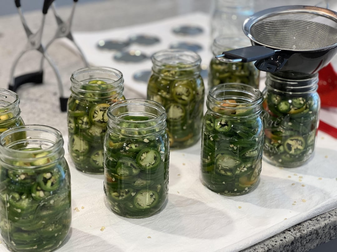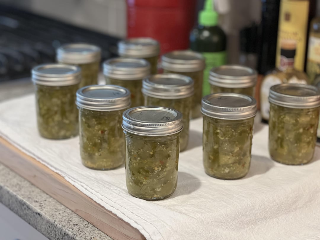 Pickled jalepenos final and in progress and tomatillo salsa