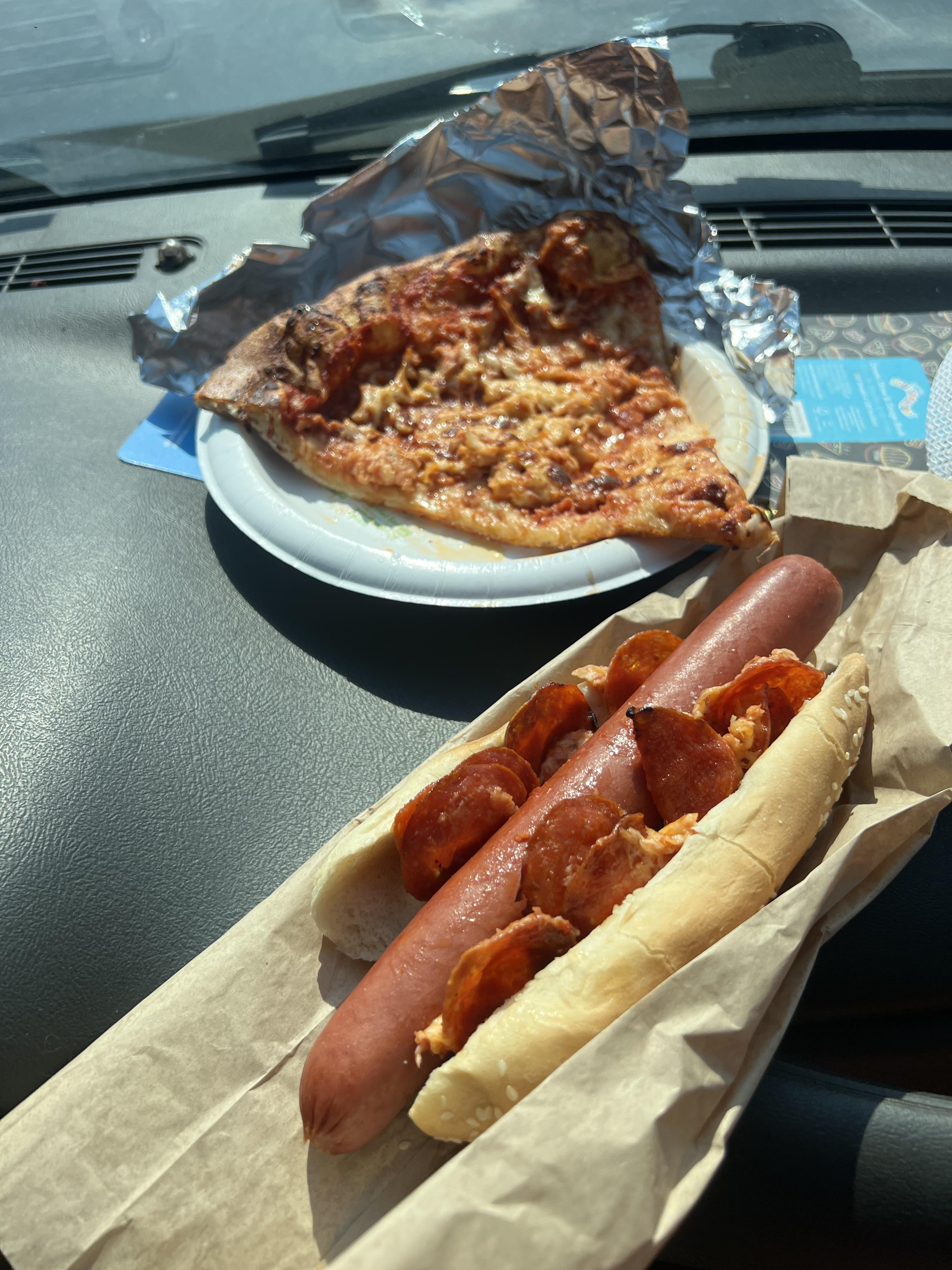 I would ditch the hot dog bun and roll the dog in the pizza slice for the win.