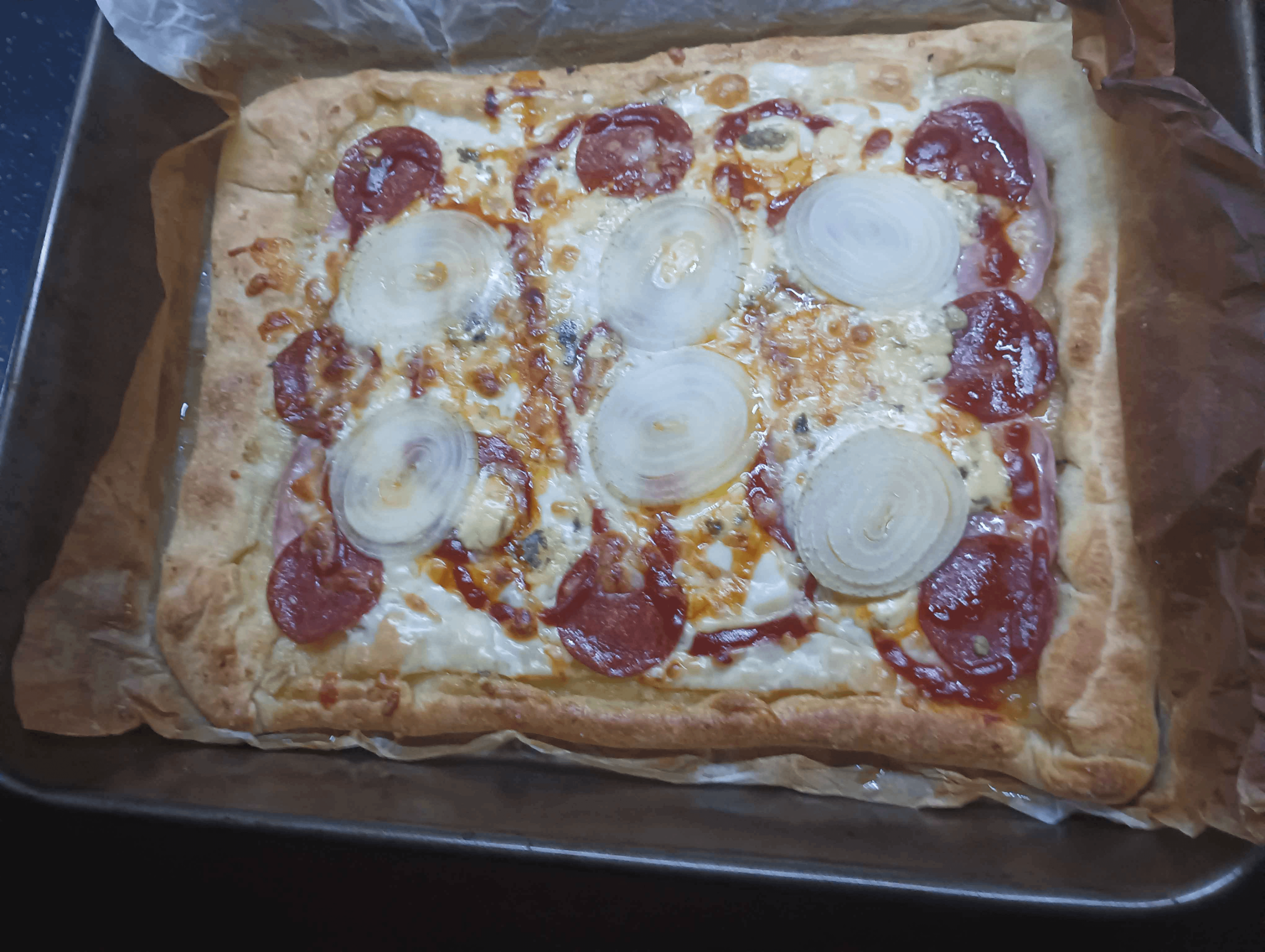 a friend of mine made a pizza. His apparent toppings: “Blue cheese, cheese no idea what kind, pepperoni, ham, onion (raw) and stuff…”
