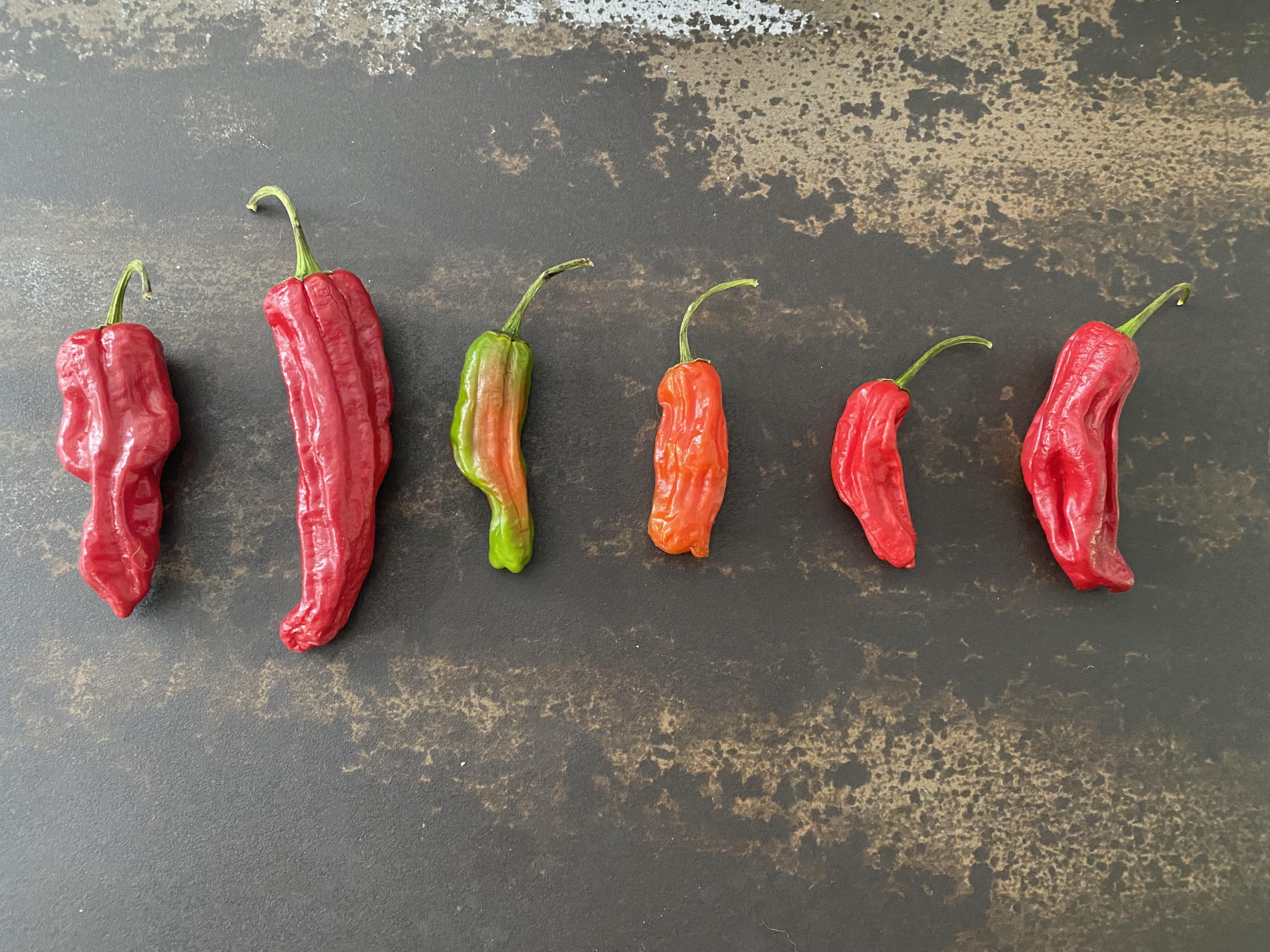 Bhut_Jolokia400 1 year ago Left to RightGhost PepperRed Bhut JolokiaNaga Bhut JolokiaDorset Naga / Red FatalilAnaheim PepperTombstone Ghost Pepper