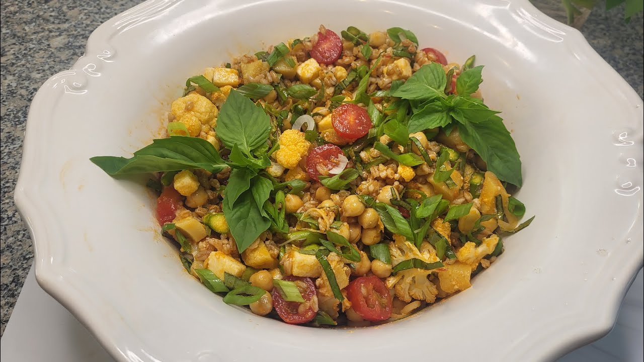 Farro, Chickpea, Asparagus, Cauliflower Salad with Calabrian Chili Tomato Dressing and Basil
