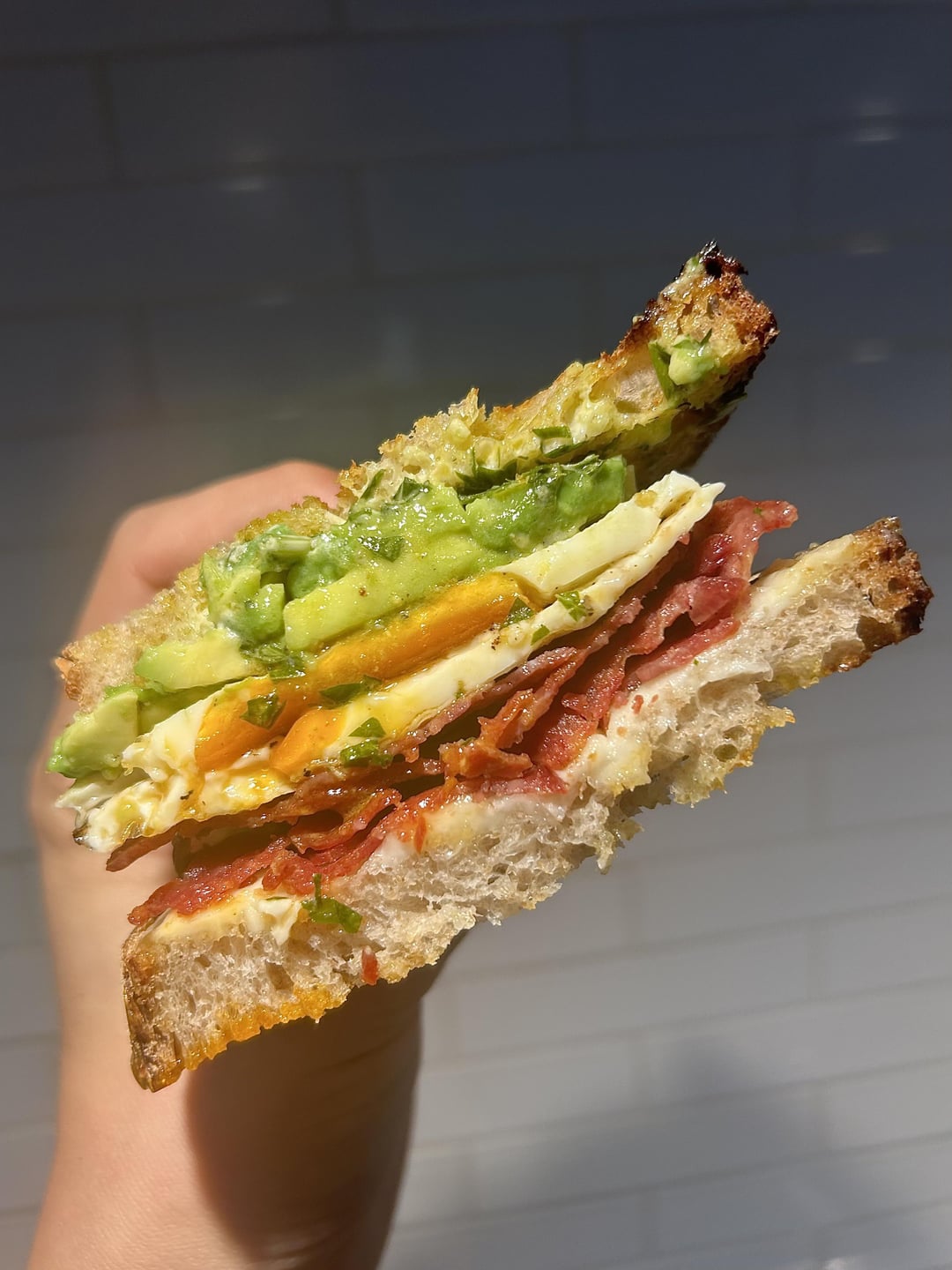 avocado, egg, cheese, chimmichurri, and turkey bacon (tragic, i know) on pain au levain