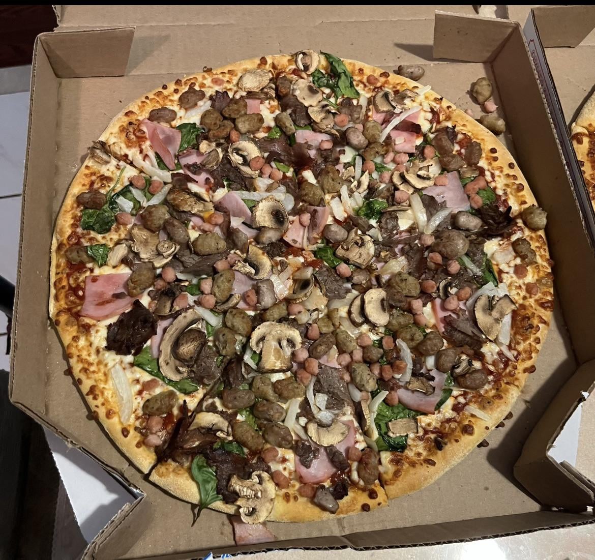 Medium pizza with… Basically everything. How many things is that? I counted and it was 18 different toppings.