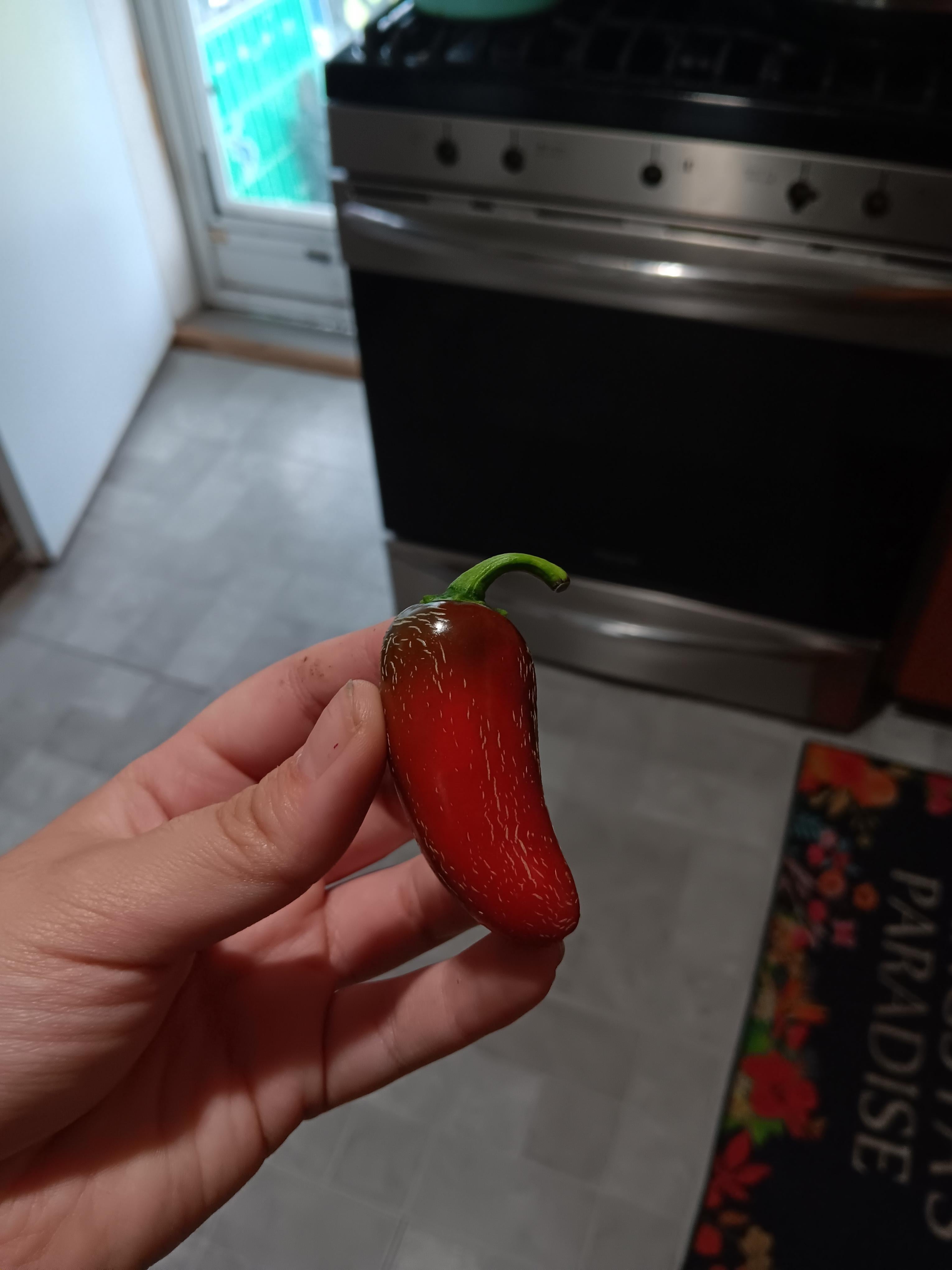 Our Jalapeños cross-pollinated with our Thai Chilis. Tastes only of grass and pain. My mother almost choked to death after eating one. Anyone know what's the deal with the striations though?
