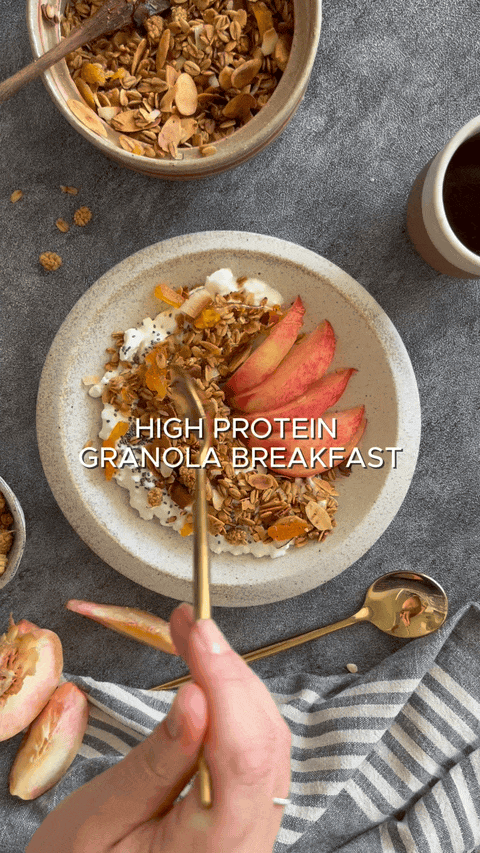 tonya_cooks 1 year ago Recipe**Ingredients:**– Rolled oats, 300g– Almond flakes, 100g– Coconut flakes, 50g– Cinnamon, 1/4 tsp– Sugar-free syrup, 3 Tbsp– Vanilla extract, 1 tsp– Coconut oil, 30g– Salt, pinch– Mulberries, 40g– Dried apricots, 30g– Cottage cheese, 100g– Chia seeds, 1/2 tsp– Fresh peaches, 1/2– Honey, 1tbps**Instructions**:1. Mix the rolled oats, almonds, and coconut flakes in a bowl.2. Add cinnamon, sugar-free syrup, vanilla extract, coconut oil, and a pinch of salt. Mix well.3. Transfer the mixture to a baking tray and bake at 170°C (338°F) for 30 minutes, stirring occasionally.4. Add mulberries and sliced dried apricots to the baked granola.5. Arrange cottage cheese on a serving plate and sprinkle with chia seeds and granola.6. Top with fresh peach slices and a drizzle of honey.Originally posted on my youtube channel [https://www.youtube.com/shorts/lITYn4-t32M](https://www.youtube.com/shorts/lITYn4-t32M)Enjoy!