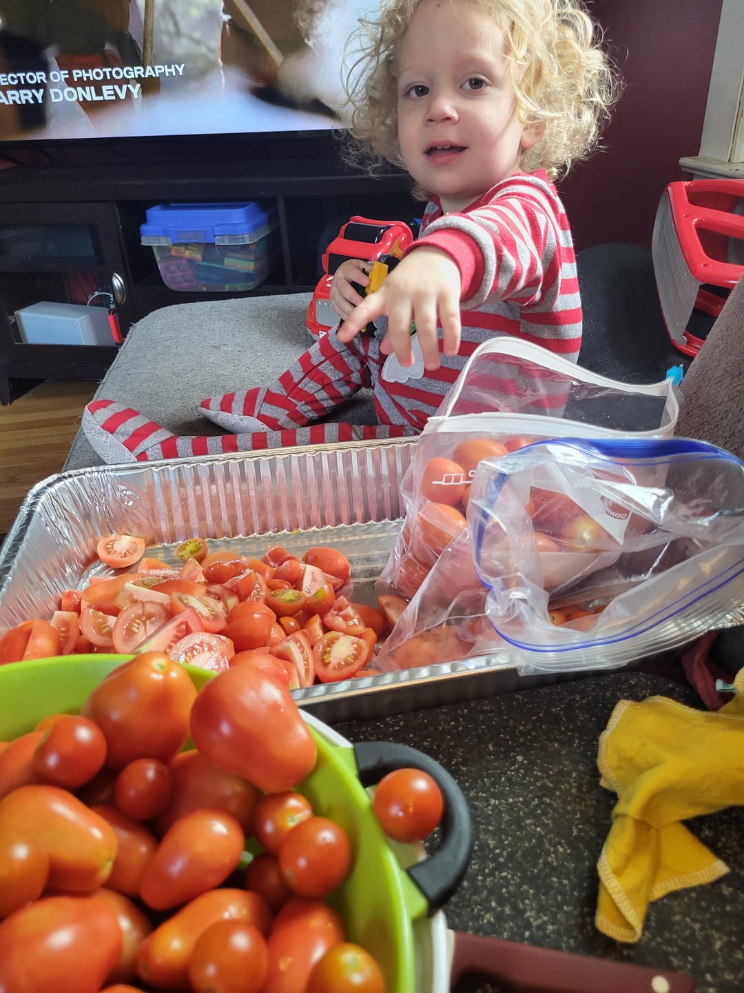 I’m a stay at home mom with two young children. Figured the best way to cut all my tomatoes was to bring it all I the living room. My son just sat there supervising.