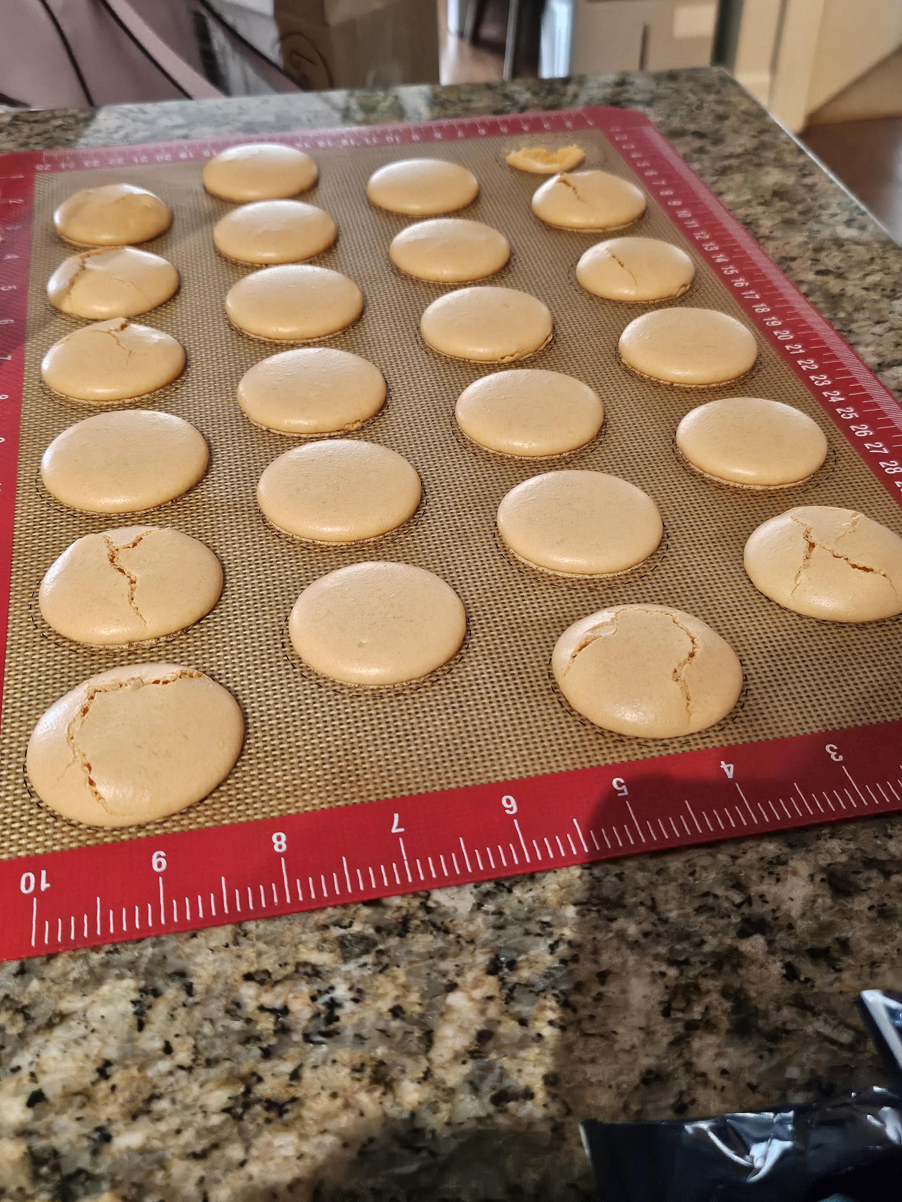I normally do classic French method but have been having humidity issues lately (so many volcanoes) so I wanted to try sugar beans no rest method and for some reason half the tray is coming out like this? Even worse on the second tray baking right now. I'm using a conventional oven, 250f for 3 minutes with the door open to dry out, 15 minutes at 295f and then 2 minutes with the door open and the oven off. I've been making macs for years so I doubt it's a macronage issue, it's possibly an oven issue but I wasn't having these problems until recently. Any advice? I'm at my wits end and have to get 5 batches done for the weekend 🙃