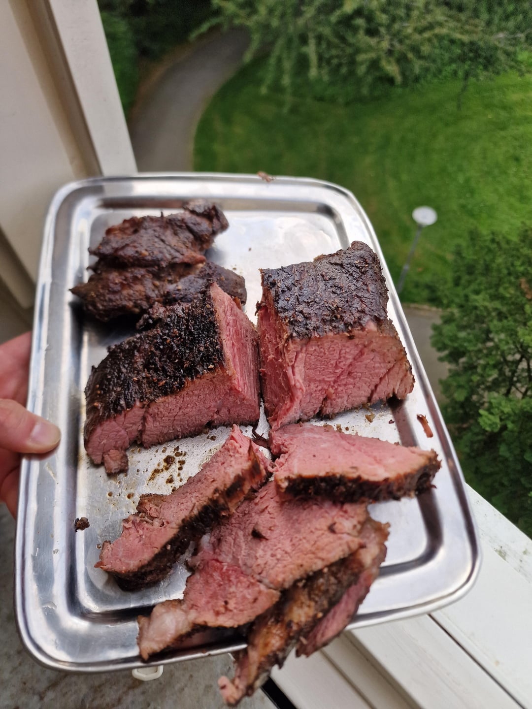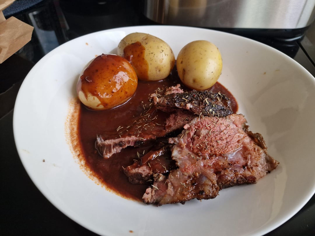 After sous vide, patted it dry and let it rest for about 30 min before searing on piping hot pan with butter. Perfection, tender and juicy like a great steak. With the meat juice I made a red wine sauce served with steamed taters.