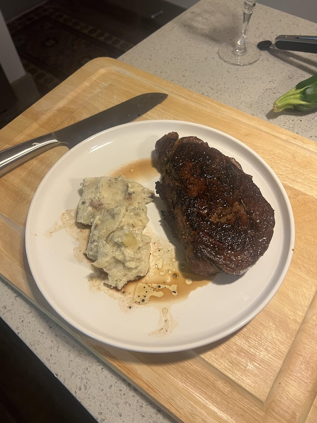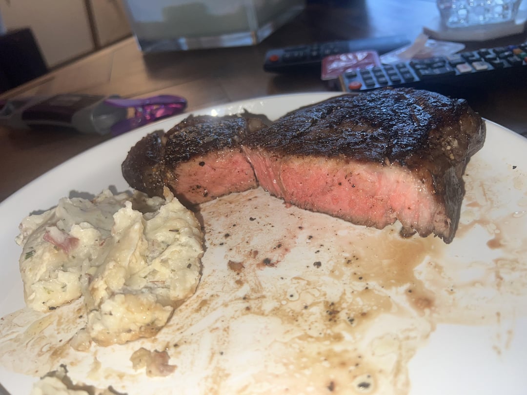 honestly looks pretty good, i mightve seared it a bit more or a bit more salt/pepper/butter to get a more even crust but it looks good, i think a cross section looksnice potatoes look pleasnt