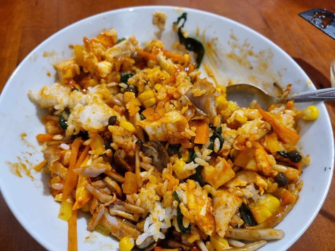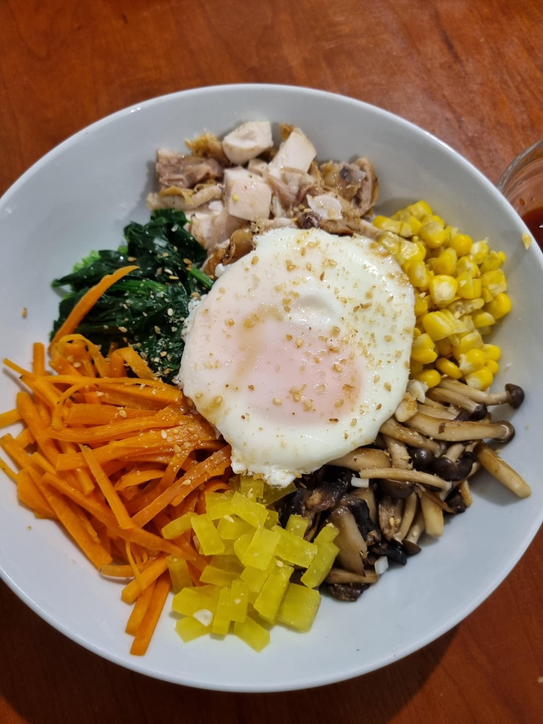 The mix-ins were leftover roast chicken, corn, blanched spinach, sauteed mushrooms, sauteed carrots, pickled radish, and there’s a tiny bit of diced raw onion under the egg. Love the bite and crunch it has!