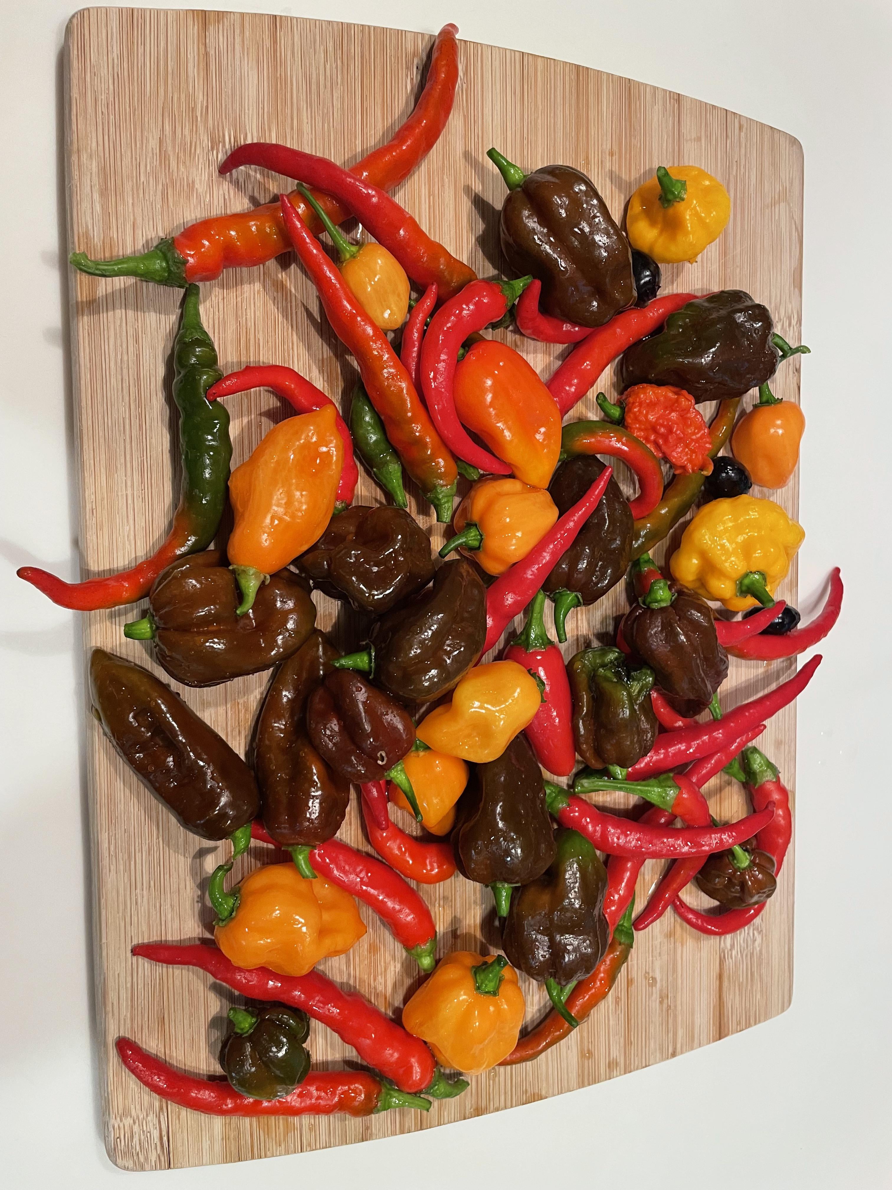 Okay, I’m really new so I’m going to guess what these might be, can someone please let me know what they actually are, I think the skinny ones are Thai chilli, I think the orange ones are ghost and the brown ones too? I think I see a red jalapeno and there’s a gnarly looking red one that might be a reaper? And I think there’s (not) scotch bonnet but the other one that looks like it. Am I close on any of these?