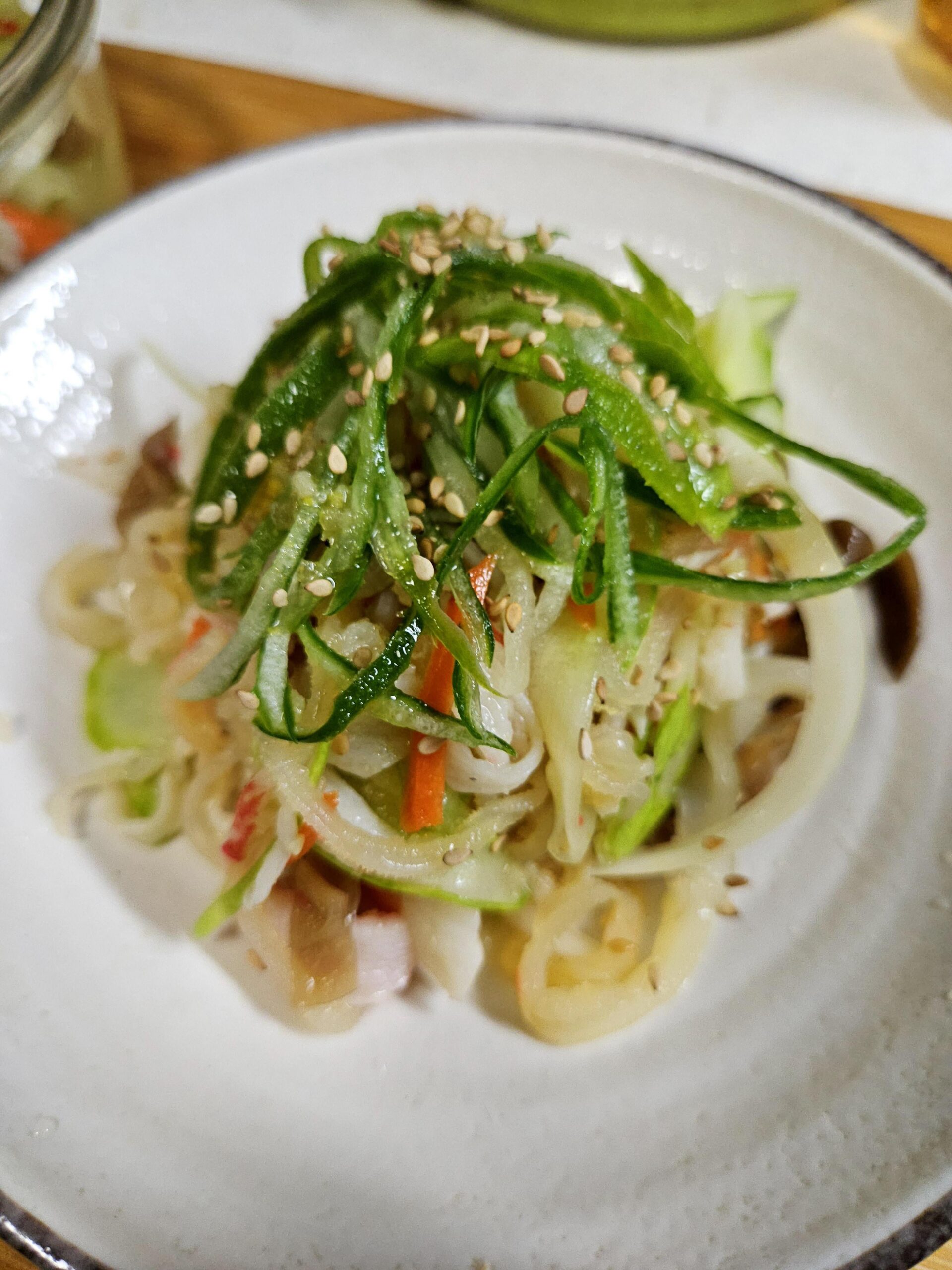 Jellyfish, cucumber, crab meat, carrot, mushroom, onion, mustard, vinegar, sugar, lemon juice, minced garlic, sesame seeds, etc.