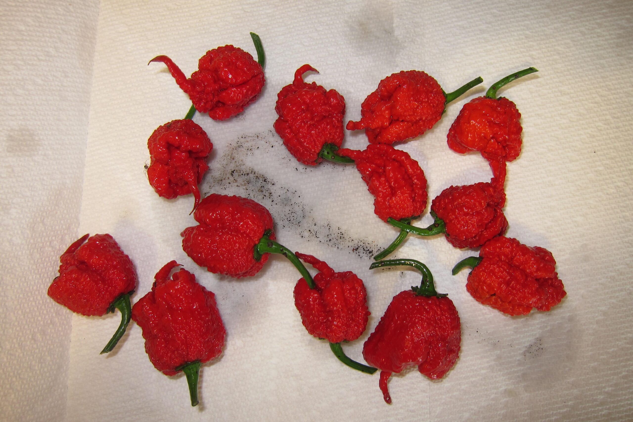 Hehe. Had a coworker bring in a crapton of Reapers & I took some home, took the stems off and seeds out and baked them on very low (around 200) on some parchment paper for a few hours. When they were dry enough to crumble, I crushed them into small flakes and put em in a spice shaker & put a little on pizza. Pain pizza, for sure!