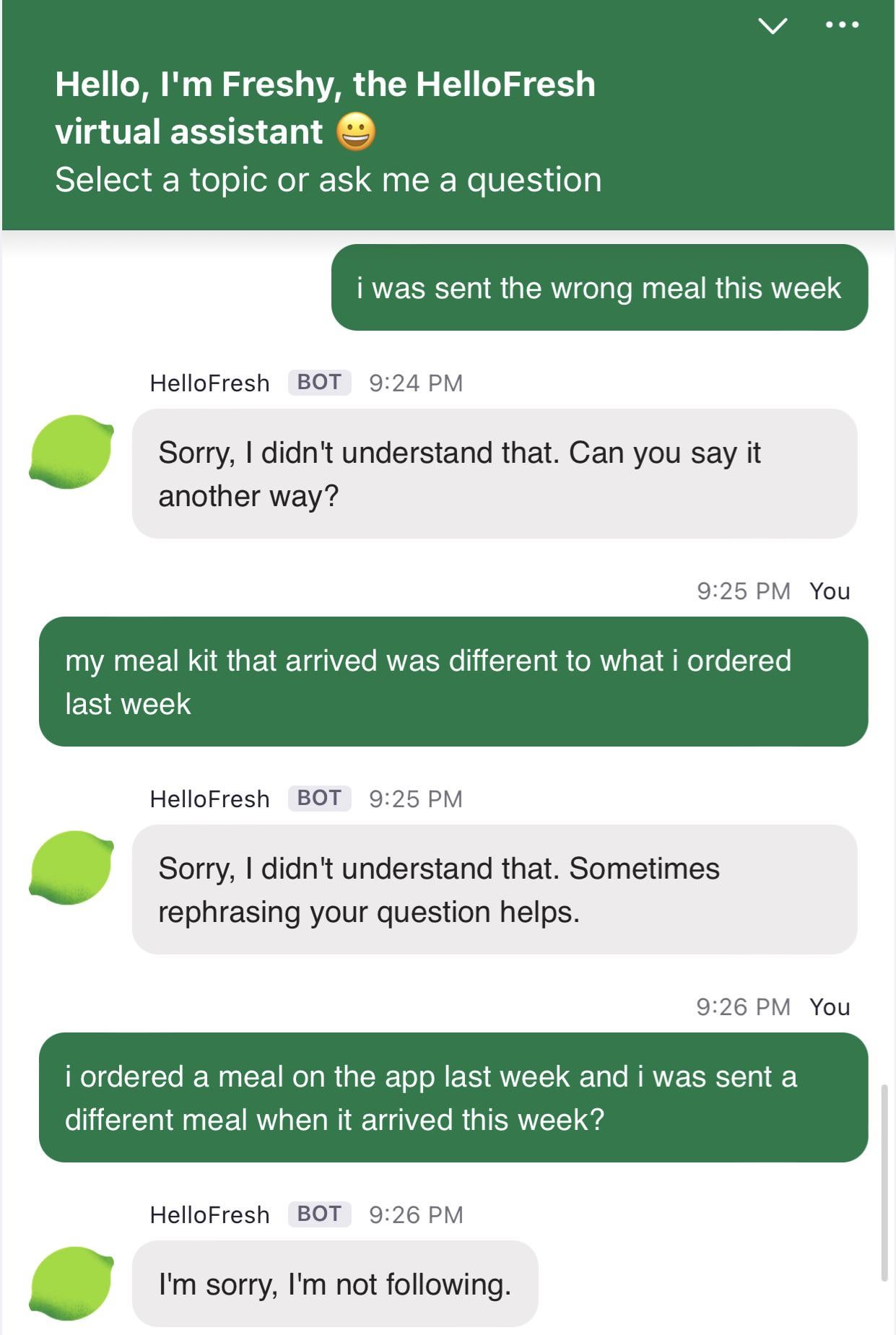 In any case, there is no need to chat with the bot. Use wrong ingredients/meals UI and select everything that’s wrong and it will calculate the refund for you.