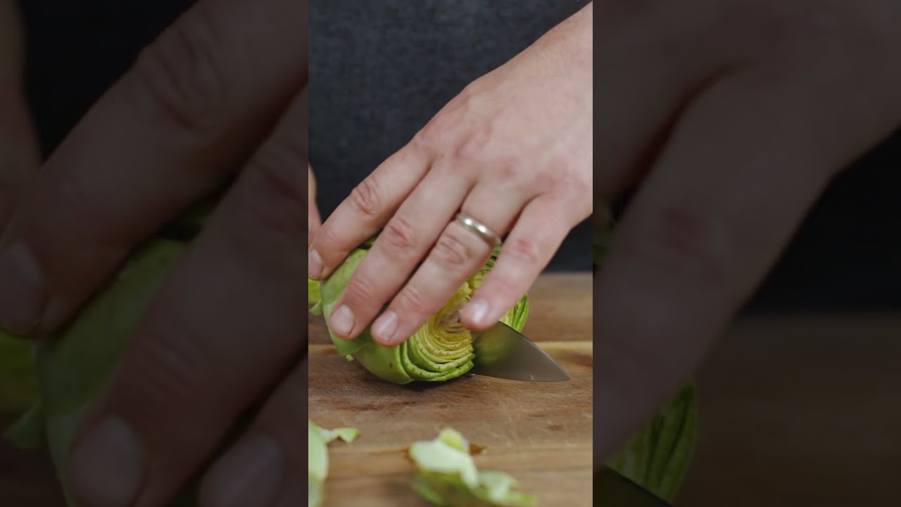 1. Using a paring knife, trim the artichoke stems if necessary and peel around the outside of the stem to remove the hard woody exterior.