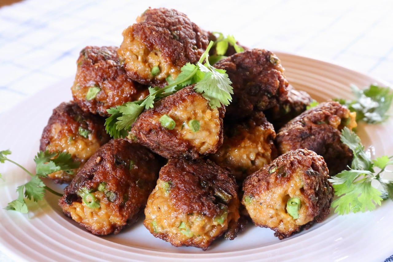 * Set a wire rack on a cookie sheet. Working in batches fry the meatballs until they are crisp and golden brown on all sides, turning as needed, about 3 minutes. Drain the meatballs on the wire rack until slightly cooled.