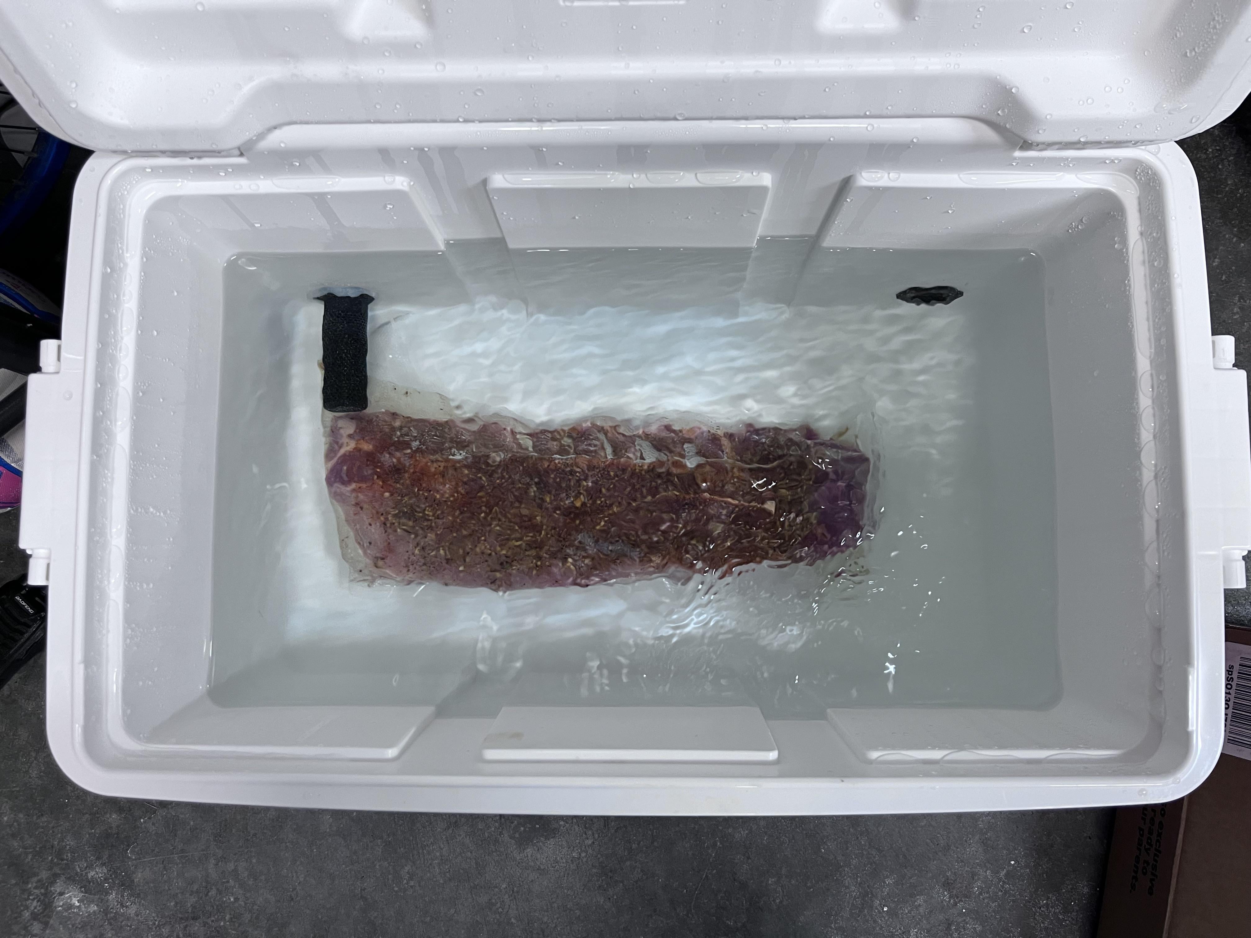 Just dropped by first baby back ribs in my newly build 48q 1000w recirculating cooler. So happy to have plenty of room and not have to hack a hole in the lid. Now I can also use my anova in the kitchen for sides or other stuff.