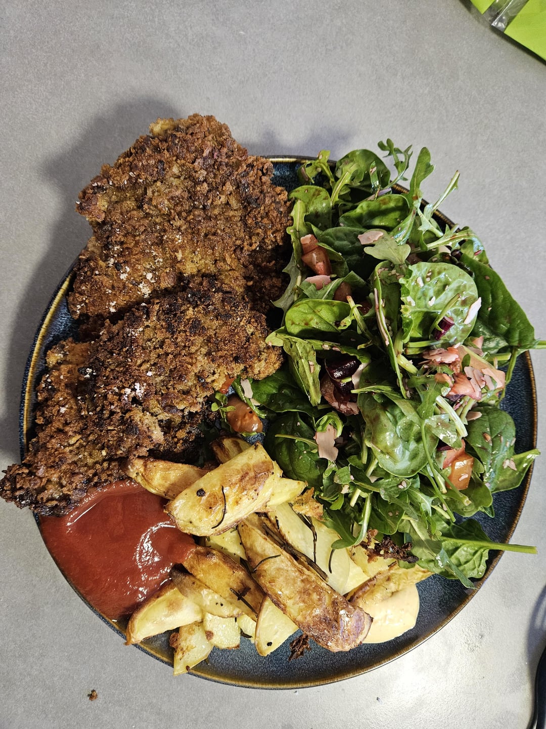 I would have bought some chicken breast and made Aussie spice crumbed chicken, topped with passata and melted cheese, with rosemary roasted potatoes and apple salad.