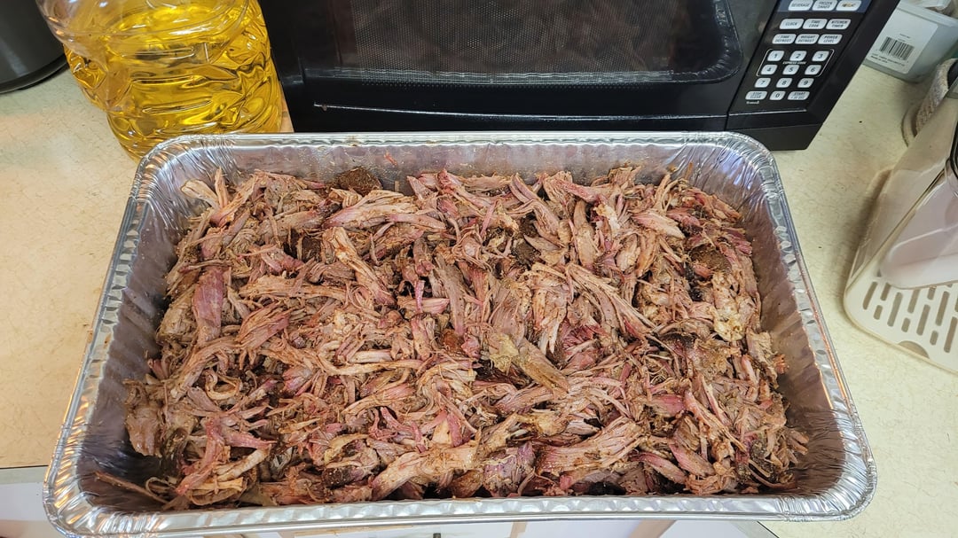 Worked like a champ! Took about 20 hours. Wrapped at 165. Rest after internal temps reached 200. Chilled and pulled with drippings and half cup of apple cider vinegar mixed in. Going to vacuum pack for this weekend. Now, gotta get some bread dough started for slider buns…