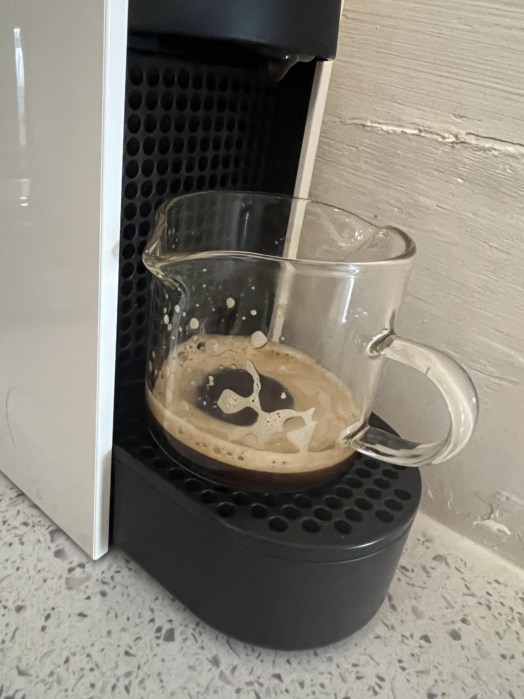 It was this much, and not even strong. When I poured it into my milk it was SO light. Then I brewed another pod. Still, light. Then I brewed a Starbucks pod… and my coffee is still not as strong as I’d like it to be. Using 3 pods for a mediocre shot is a waste of money. What am I doing wrong? I just got this Essenza Mini.