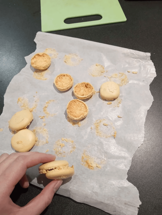 The lopsided macaron feet were my 2nd batch (with cocoa powder on top), which I’d left to dry for 2 hours as an experiment instead of drying for 1 hour + 110 celsius for 3 mins in a closed air fryer which came out perfect, except for the underbaking problem. I think it’s something to do with proteins breaking down in the macaron?
