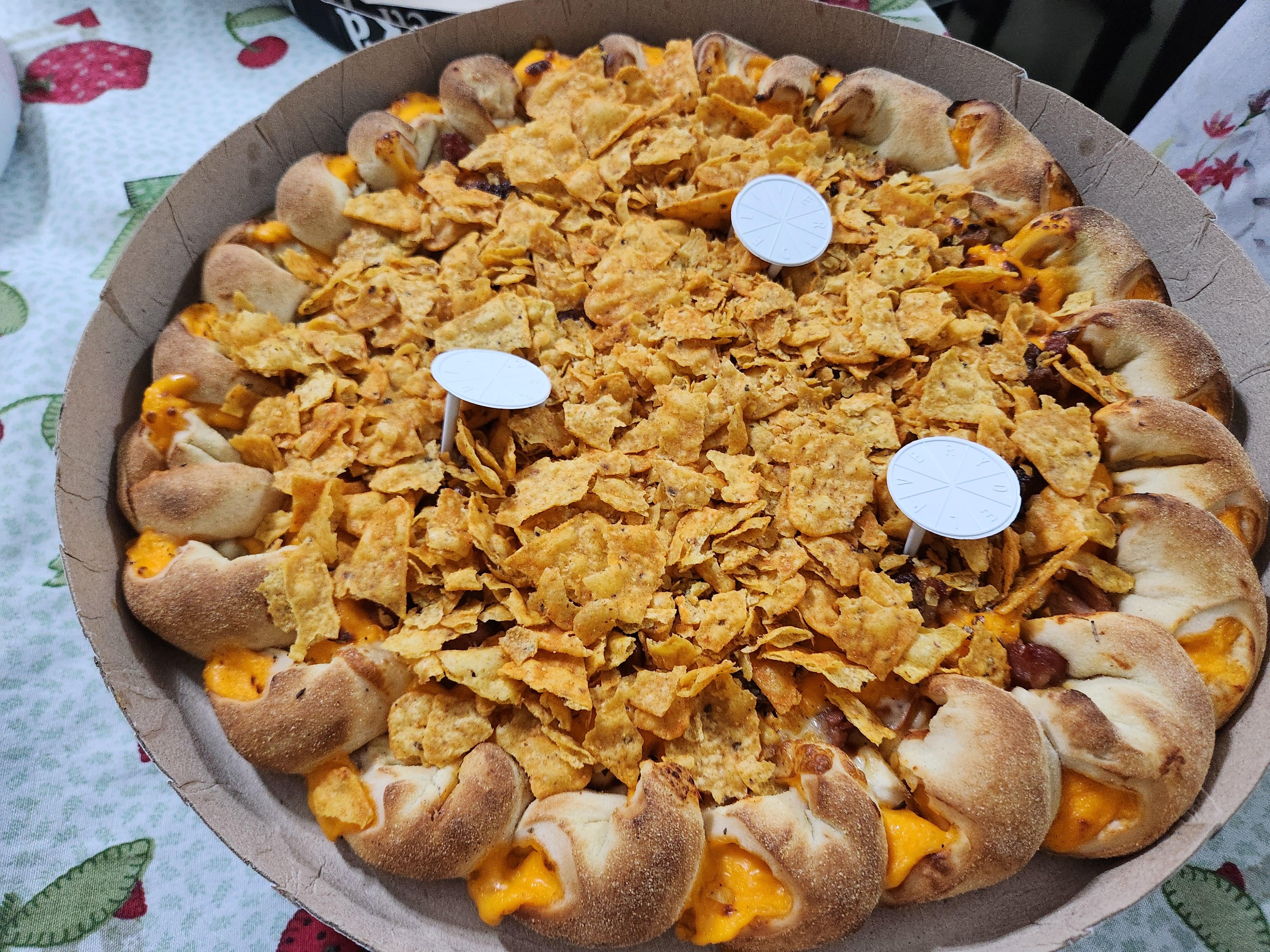 That’s… I mean doesn’t look bad. But is it even pizza? It looks like nachos without the cheese or toppings, surrounded by cheezey bread ballz.
