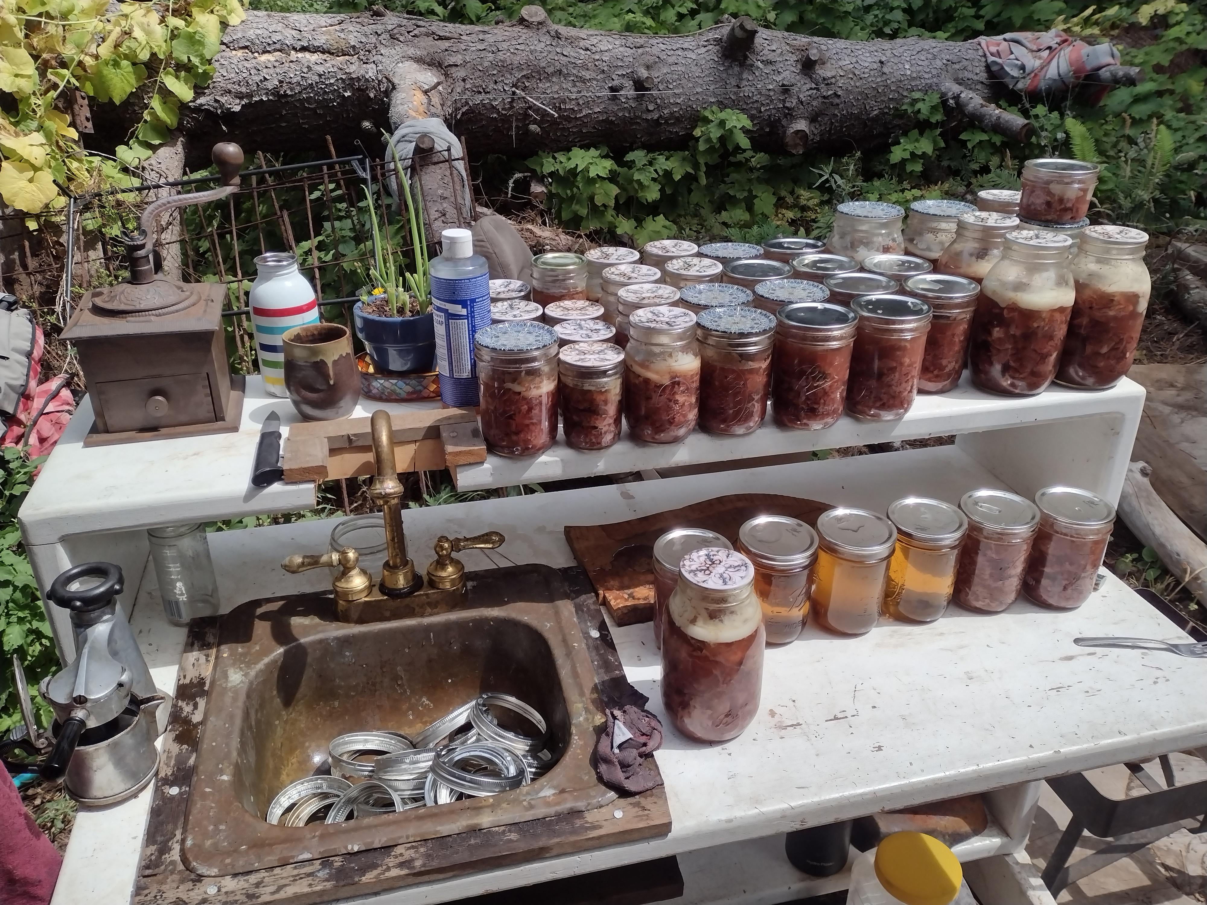 One of two semi feral adult sheep I processed this year. Each weighed around 130-140 lbs, got 42 pints from each but the second batch was packed tighter, with less fat and correct headspace. Would rather have a picture of that one, but it didn't work out that way! Canned everything but the flanks and neck.