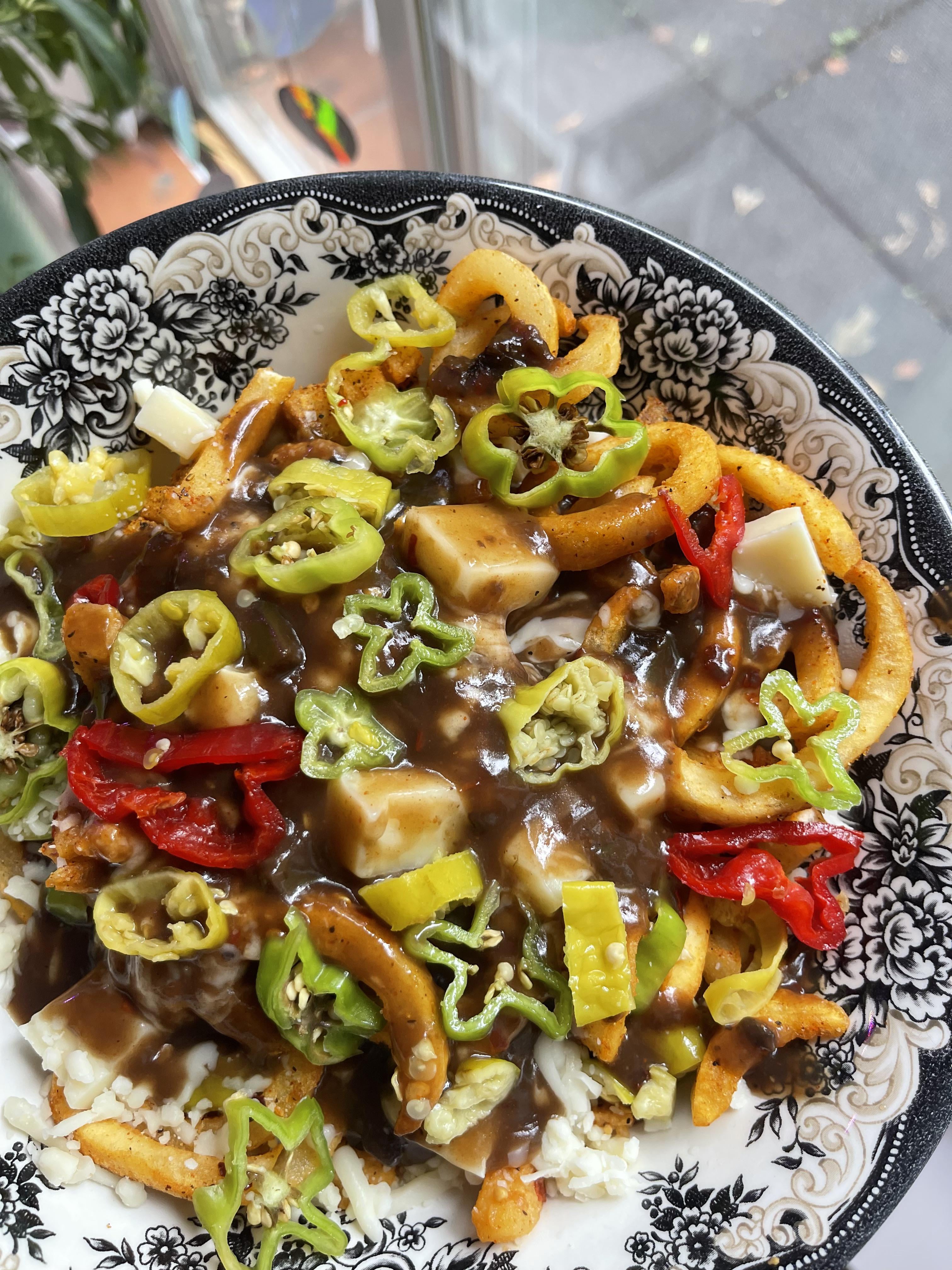 I’m normally a poutine purist; I don’t like the “smoked meat poutine” or the peas or frankly even green onion garnish. Gimme a styrofoam container full of lava-hot plastic-fork-melting fries and cheese curds in gravy pretty much over any of them.