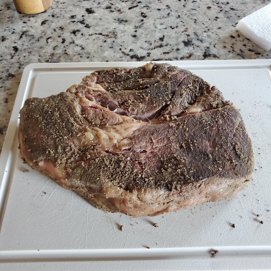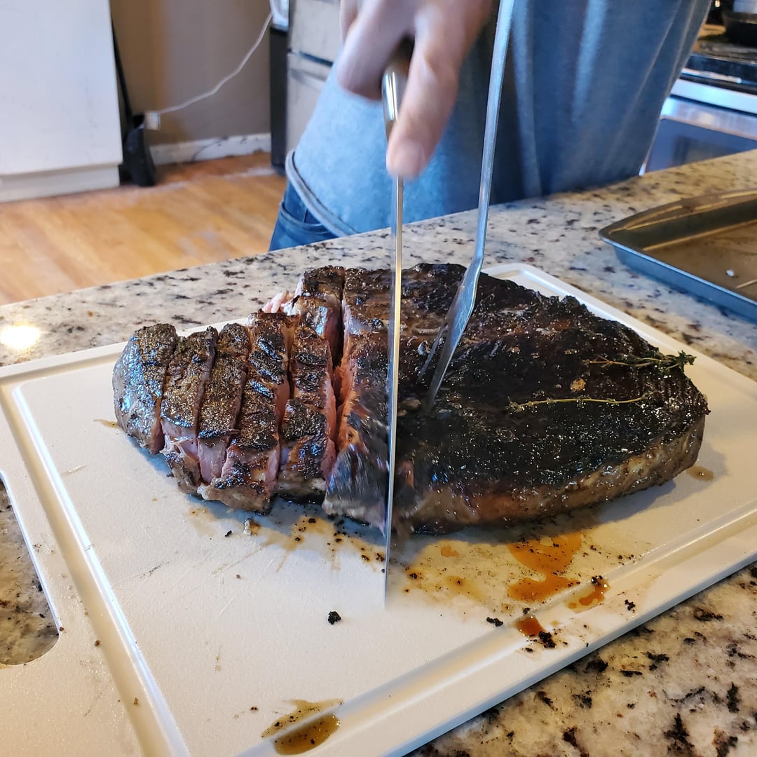 Long time lurker, first time poster. Took a chuck pot roast and seasoned with salt, pepper, garlic and onion powder. Added to a vacuum bag with thyme and rosemary. 24 hours in the sous vide at 130 degrees. Rested for 20 minutes and seared in a pipping hot cast iron skillet while simultaneously blow torching. Rested for 15 minutes and then got oil and butter smoking hot with the leftover aromatics.