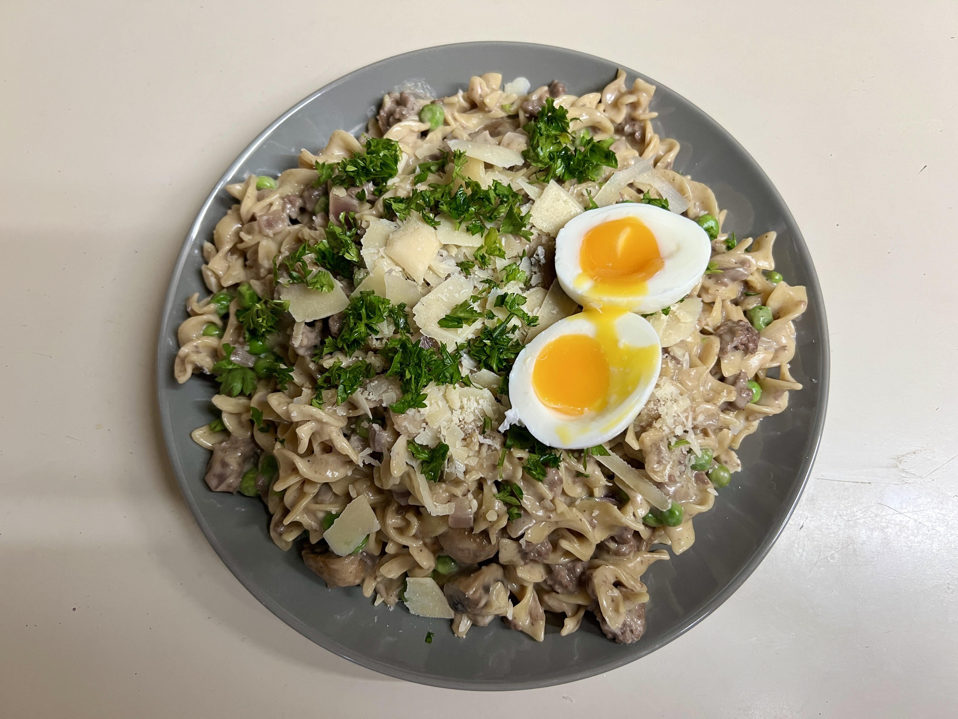 Last night’s dinner: bison stroganoff, zhuzhed up with parsley, parmesan, and of course a soft boiled egg.