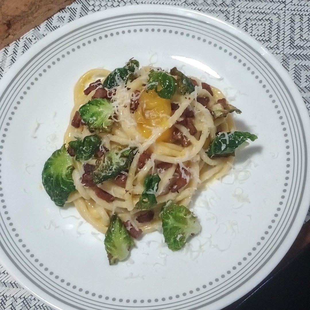 Bucatani Carbonara with Guanciale, Lemon Cured Egg Yolk, Fried Brussel Leaves
