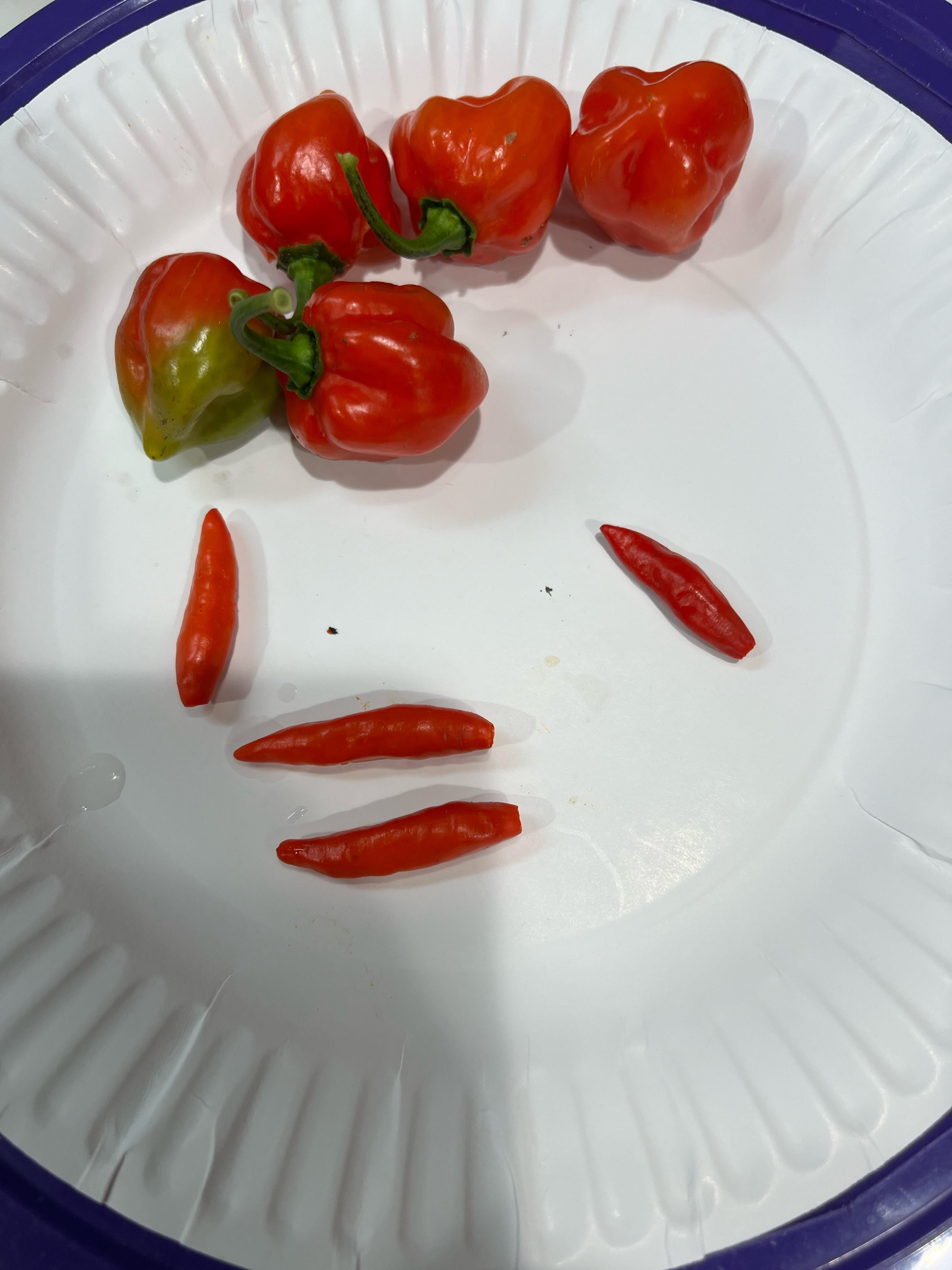 The larger ones appear to be Habaneros, could be Red Savina Habaneros. The smaller ones look a lot like my Tobasco peppers.